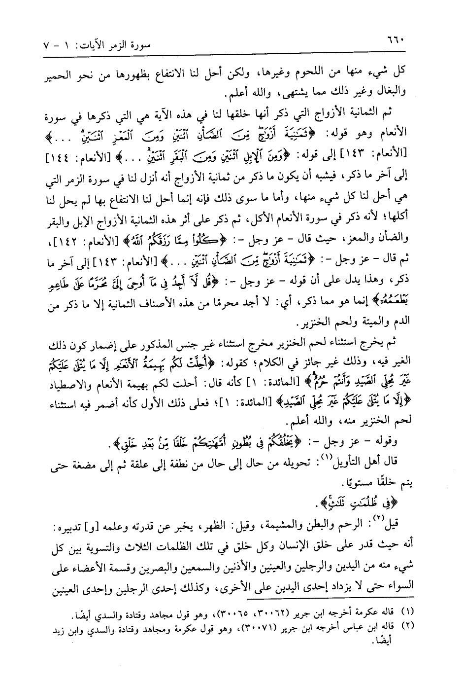 ثم الثمانية الأزواج التي ذكر أنها خلقها لنا في هذه الآية هي التي ذكرها في سورة الأنعام وهو قوله: (ثَمَانِيَةَ أَزْوَاجٍ مِنَ الضَّأْنِ اثْنَيْنِ وَمِنَ الْمَعْزِ اثْنَيْنِ. . .)، إلى قوله: (وَمِنَ الْإِبِلِ اثْنَيْنِ وَمِنَ الْبَقَرِ اثْنَيْنِ. . .)، إلى آخر ما ذكر، فيشبه أن يكون ما ذكر من ثمانية الأزواج أنه أنزل لنا في سورة الزمر التي هي أحل لنا كل شيء منها، وأما ما سوى ذلك فإنه إنما أحل لنا الانتفاع بها لم يحل لنا أكلها؛ لأنه ذكر في سورة الأنعام الأكل، ثم ذكر على أثر هذه الثمانية الأزواج الإبل والبقر والضأن والمعز، حيث قال - عَزَّ وَجَلَّ -: (كُلُوا مِمَّا رَزَقَكُمُ اللَّهُ)، ثم قال - عَزَّ وَجَلَّ -: (ثَمَانِيَةَ أَزْوَاجٍ مِنَ الضَّأْنِ اثْنَيْنِ. . .)، إلى آخر ما ذكر، وهذا يدل على أن قوله - عَزَّ وَجَلَّ -: (قُلْ لَا أَجِدُ فِي مَا أُوحِيَ إِلَيَّ مُحَرَّمًا عَلَى طَاعِمٍ يَطْعَمُهُ) إنما هو مما ذكر، أي: لا أجد محرمًا من هذه الأصناف الثمانية إلا ما ذكر من الدم والميتة ولحم الخنزير.