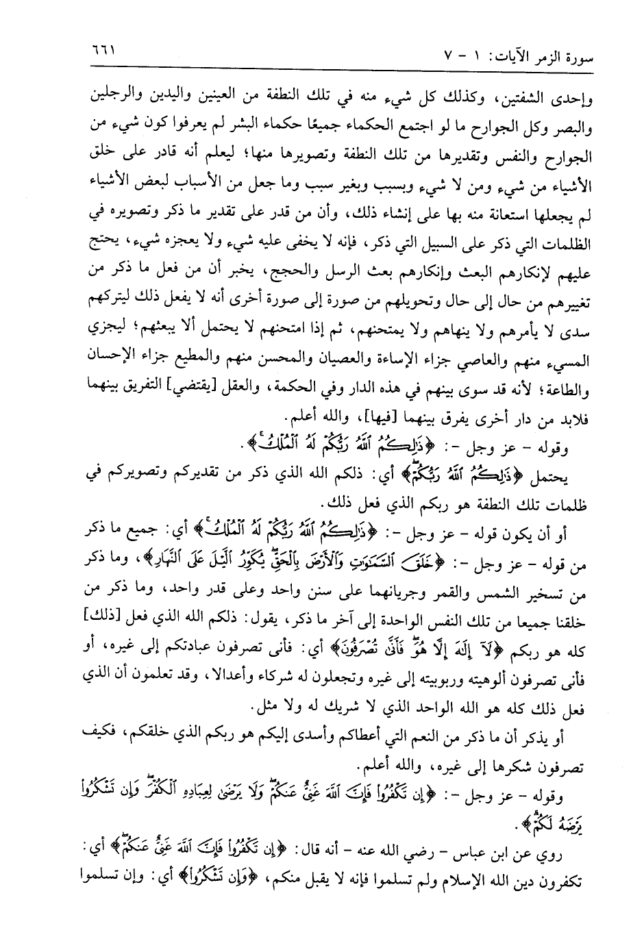 وقوله - عَزَّ وَجَلَّ -: (إِنْ تَكْفُرُوا فَإِنَّ اللَّهَ غَنِيٌّ عَنْكُمْ وَلَا يَرْضَى لِعِبَادِهِ الْكُفْرَ وَإِنْ تَشْكُرُوا يَرْضَهُ لَكُمْ وَلَا تَزِرُ وَازِرَةٌ وِزْرَ أُخْرَى ثُمَّ إِلَى رَبِّكُمْ مَرْجِعُكُمْ فَيُنَبِّئُكُمْ بِمَا كُنْتُمْ تَعْمَلُونَ إِنَّهُ عَلِيمٌ بِذَاتِ الصُّدُورِ (7)