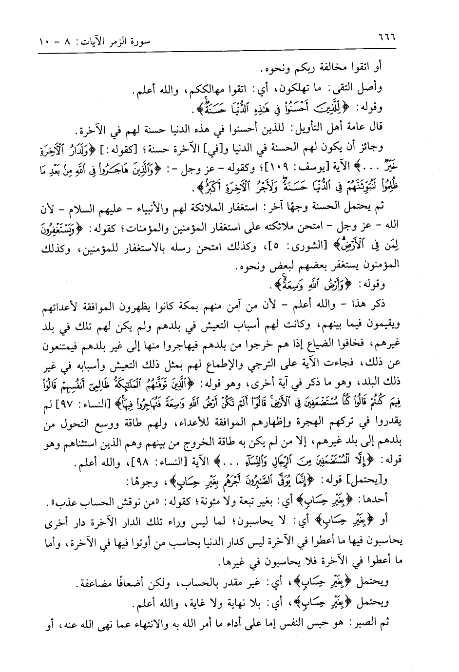 ويحتمل قوله: (إِنَّمَا يُوَفَّى الصَّابِرُونَ أَجْرَهُمْ بِغَيْرِ حِسَابٍ)، وجوهًا: