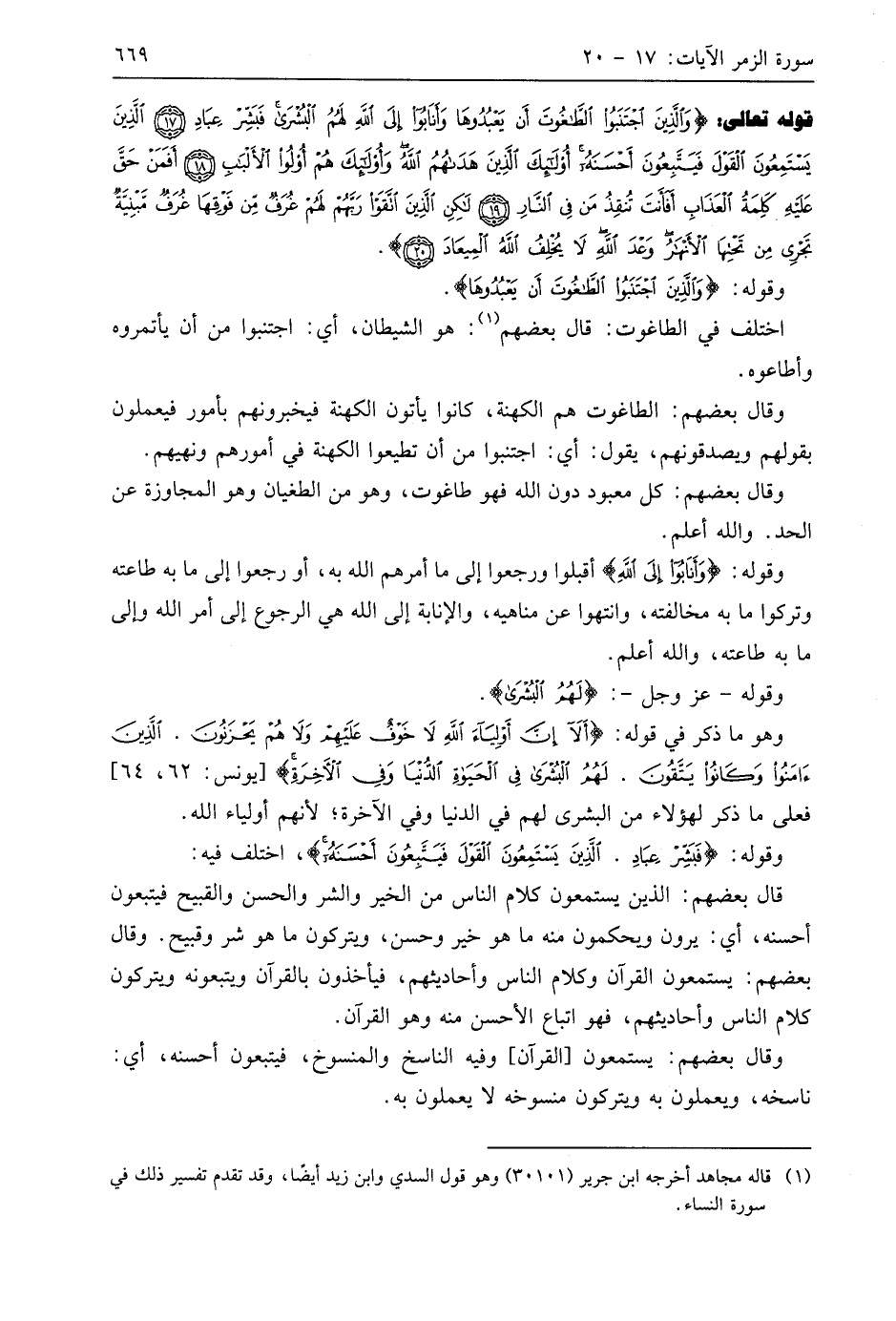 اختلف في الطاغوت: قَالَ بَعْضُهُمْ: هو الشيطان، أي: اجتنبوا من أن يأتمروه وأطاعوه.