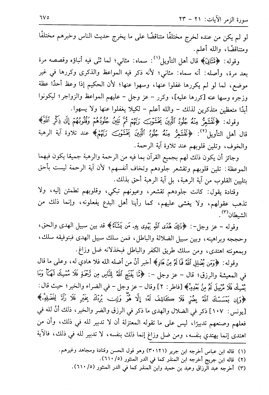 وقوله: (تَقْشَعِرُّ مِنْهُ جُلُودُ الَّذِينَ يَخْشَوْنَ رَبَّهُمْ ثُمَّ تَلِينُ جُلُودُهُمْ وَقُلُوبُهُمْ إِلَى ذِكْرِ اللَّهِ) قال أهل التأويل: (تَقْشَعِرُّ مِنْهُ جُلُودُ الَّذِينَ يَخْشَوْنَ رَبَّهُمْ) عند تلاوة آية الرهبة والخوف، وتلين قلوبهم عند تلاوة آية الرحمة.