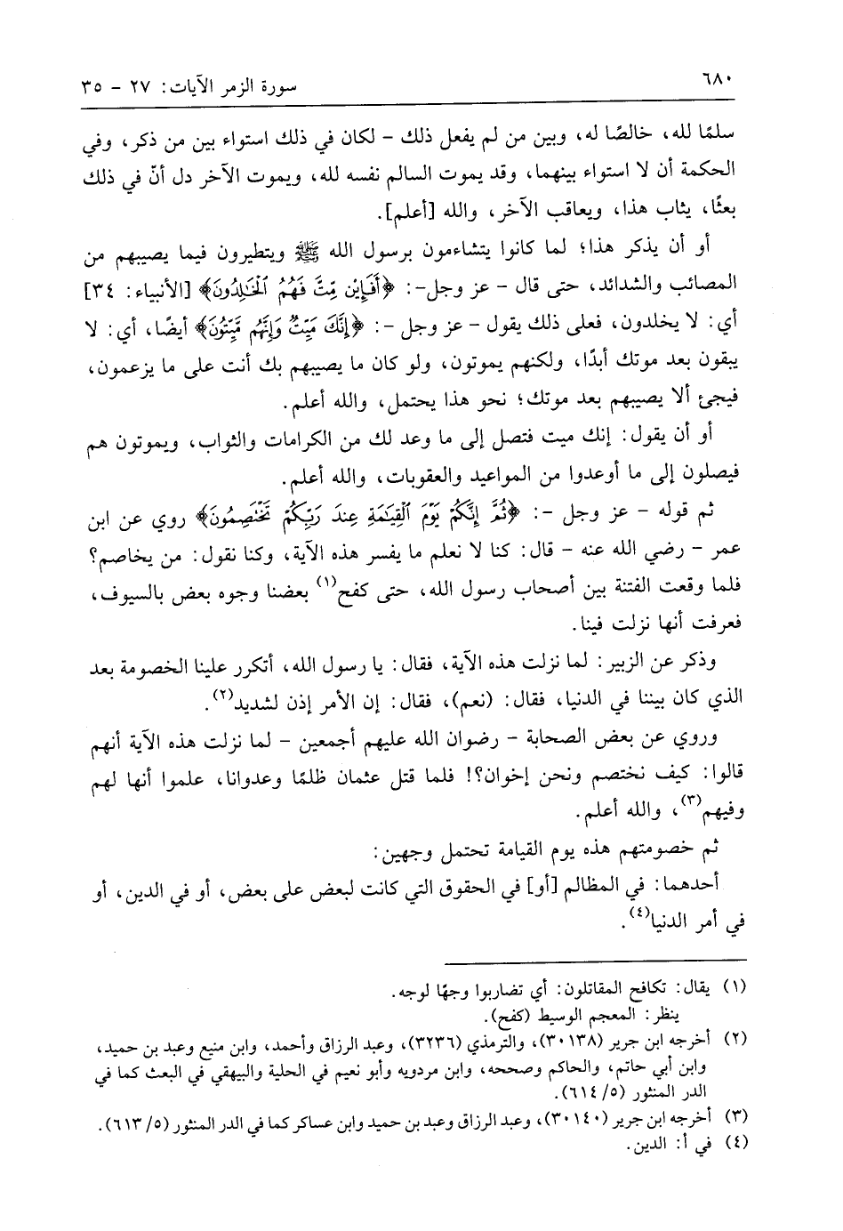 ثم قوله - عَزَّ وَجَلَّ -: (ثُمَّ إِنَّكُمْ يَوْمَ الْقِيَامَةِ عِنْدَ رَبِّكُمْ تَخْتَصِمُونَ (31) روي عن ابن عمر - رَضِيَ اللَّهُ عَنْهُ - قال: كنا لا لعلم ما يفسر هذه الآية، وكنا نقول: من يخاصم؟ فلما وقعت الفتنة بين أصحاب رسول اللَّه، حتى كفح بعضنا وجوه بعض بالسيوف، فعرفت أنها نزلت فينا.