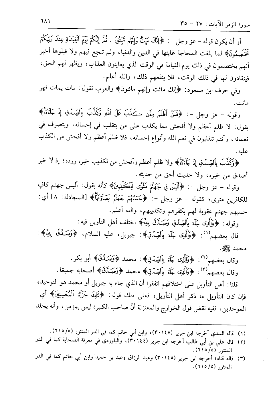 قَالَ بَعْضُهُمْ: (وَالَّذِي جَاءَ بِالصِّدْقِ): جبريل، عليه السلام، (وَصَدَّقَ بِهِ): مُحَمَّد - صَلَّى اللَّهُ عَلَيهِ وَسَلَّمَ -.