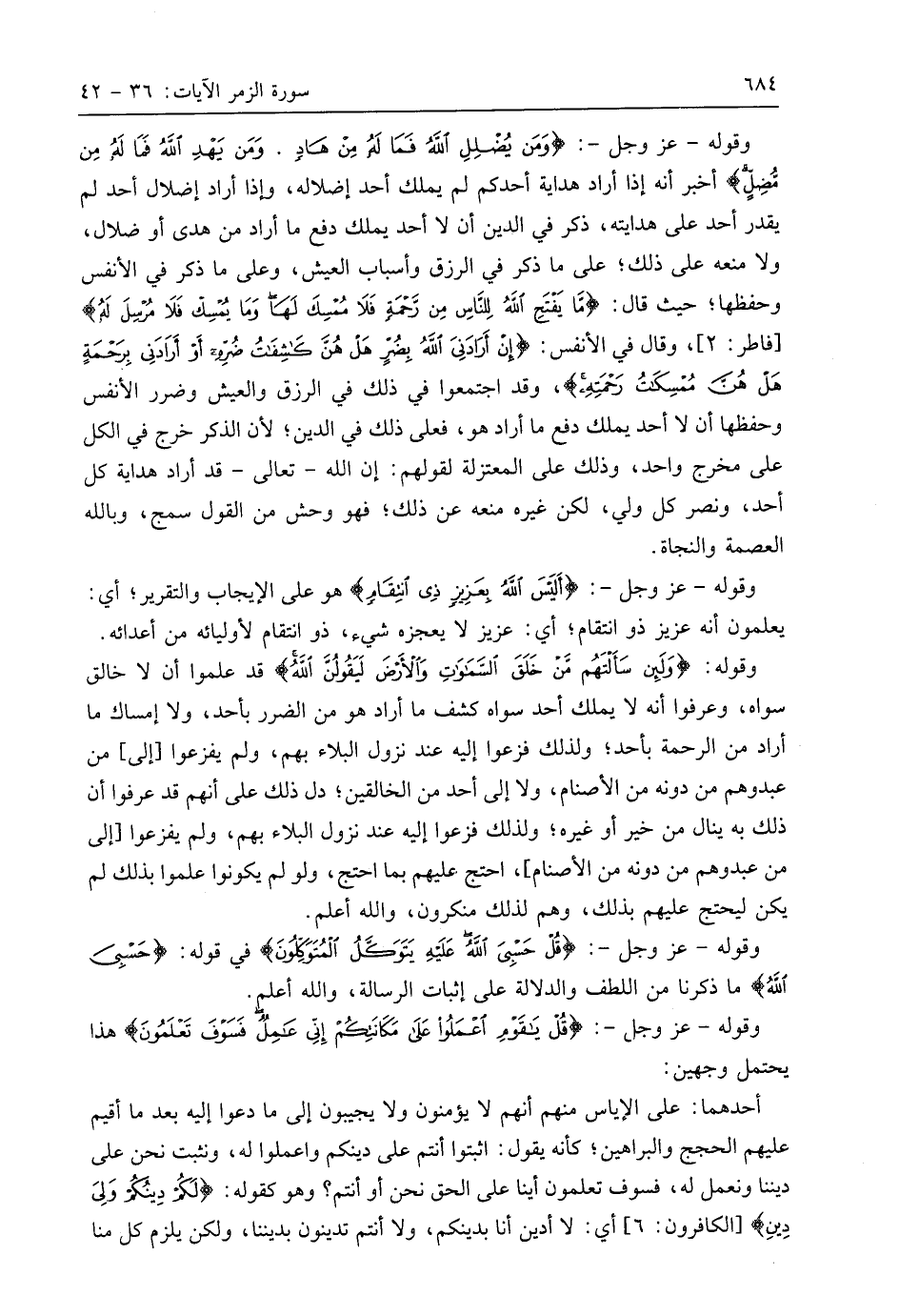 وقوله - عَزَّ وَجَلَّ -: (وَمَنْ يُضْلِلِ اللَّهُ فَمَا لَهُ مِنْ هَادٍ (36) وَمَنْ يَهْدِ اللَّهُ فَمَا لَهُ مِنْ مُضِلٍّ ... (37) أخبر أنه إذا أراد هداية أحدكم لم يملك أحد إضلاله، وإذا أراد إضلال أحد لم يقدر أحد على هدايته، ذكر في الدِّين أن لا أحد يملك دفع ما أراد من هدى أو ضلال، ولا منعه على ذلك؛ على ما ذكر في الرزق وأسباب العيش، وعلى ما ذكر في الأنفس وحفظها؛ حيث قال: (مَا يَفْتَحِ اللَّهُ لِلنَّاسِ مِنْ رَحْمَةٍ فَلَا مُمْسِكَ لَهَا وَمَا يُمْسِكْ فَلَا مُرْسِلَ لَهُ)، وقال في الأنفس: (إِنْ أَرَادَنِيَ اللَّهُ بِضُرٍّ هَلْ هُنَّ كَاشِفَاتُ ضُرِّهِ أَوْ أَرَادَنِي بِرَحْمَةٍ هَلْ هُنَّ مُمْسِكَاتُ رَحْمَتِهِ)، وقد اجتمعوا في ذلك في الرزق والعيش وضرر الأنفس وحفظها أن لا أحد يملك دفع ما أراد هو، فعلى ذلك في الدِّين؛ لأن الذكر خرج في الكل على مخرج واحد، وذلك على المعتزلة لقولهم: إن اللَّه - تعالى - قد أراد هداية كل أحد، ونصر كل ولي، لكن غيره منعه عن ذلك؛ فهو [وخش] من القول سمج، وبالله العصمة والنجاة.