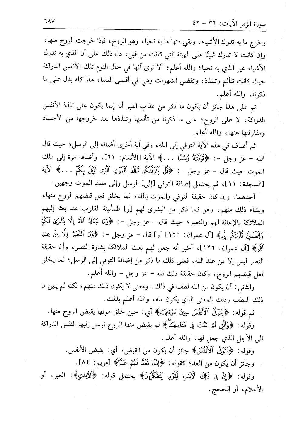 وقوله: (وَالَّتِي لَمْ تَمُتْ فِي مَنَامِهَا) لم يقبض منها الروح ترسل إليها النفس الدراكة إلى الأجل الذي جعل لها، واللَّه أعلم.