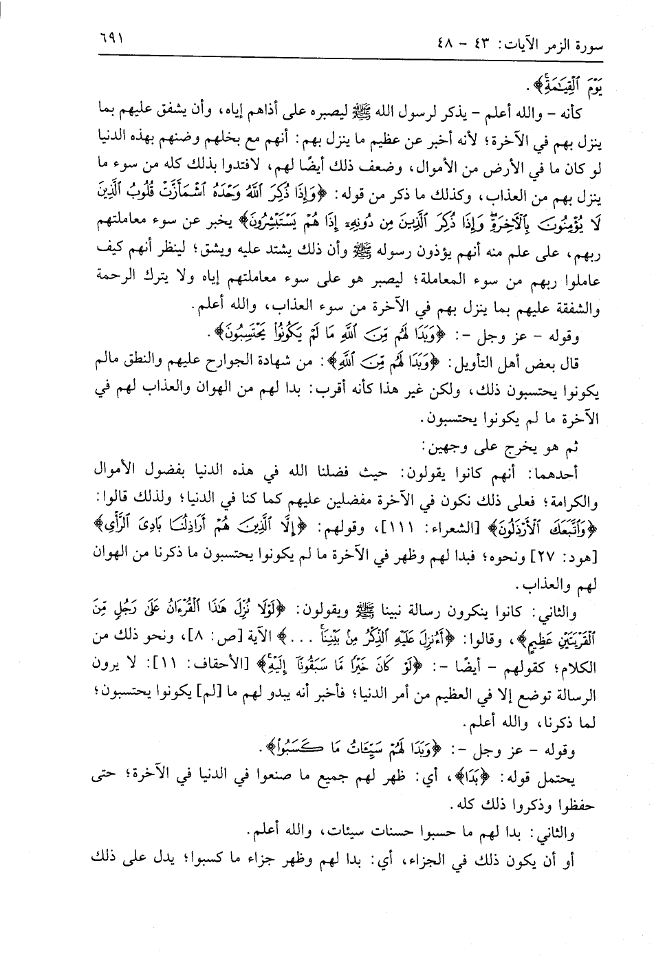 والثاني: كانوا ينكرون رسالة نبينا - صَلَّى اللَّهُ عَلَيهِ وَسَلَّمَ - ويقولون: (لَوْلَا نُزِّلَ هَذَا الْقُرْآنُ عَلَى رَجُلٍ مِنَ الْقَرْيَتَيْنِ عَظِيمٍ)، وقالوا: (أَأُنْزِلَ عَلَيْهِ الذِّكْرُ مِنْ بَيْنِنَا. . .) الآية، ونحو ذلك من الكلام؛ كقولهم - أيضًا -: (لَوْ كَانَ خَيْرًا مَا سَبَقُونَا إِلَيْهِ): لا يرون الرسالة توضع إلا في العظيم من أمر الدنيا؛ فأخبر أنه يبدو لهم ما لم يكونوا يحتسبون؛ لما ذكرنا، واللَّه أعلم.