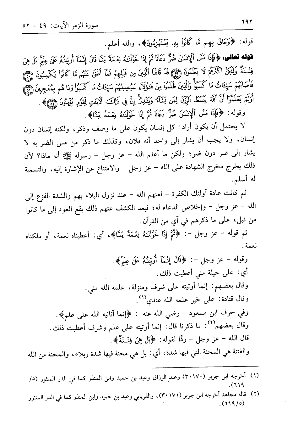 قوله تعالى: (فَإِذَا مَسَّ الْإِنْسَانَ ضُرٌّ دَعَانَا ثُمَّ إِذَا خَوَّلْنَاهُ نِعْمَةً مِنَّا قَالَ إِنَّمَا أُوتِيتُهُ عَلَى عِلْمٍ بَلْ هِيَ فِتْنَةٌ وَلَكِنَّ أَكْثَرَهُمْ لَا يَعْلَمُونَ (49) قَدْ قَالَهَا الَّذِينَ مِنْ قَبْلِهِمْ فَمَا أَغْنَى عَنْهُمْ مَا كَانُوا يَكْسِبُونَ (50) فَأَصَابَهُمْ سَيِّئَاتُ مَا كَسَبُوا وَالَّذِينَ ظَلَمُوا مِنْ هَؤُلَاءِ سَيُصِيبُهُمْ سَيِّئَاتُ مَا كَسَبُوا وَمَا هُمْ بِمُعْجِزِينَ (51) أَوَلَمْ يَعْلَمُوا أَنَّ اللَّهَ يَبْسُطُ الرِّزْقَ لِمَنْ يَشَاءُ وَيَقْدِرُ إِنَّ فِي ذَلِكَ لَآيَاتٍ لِقَوْمٍ يُؤْمِنُونَ (52)
