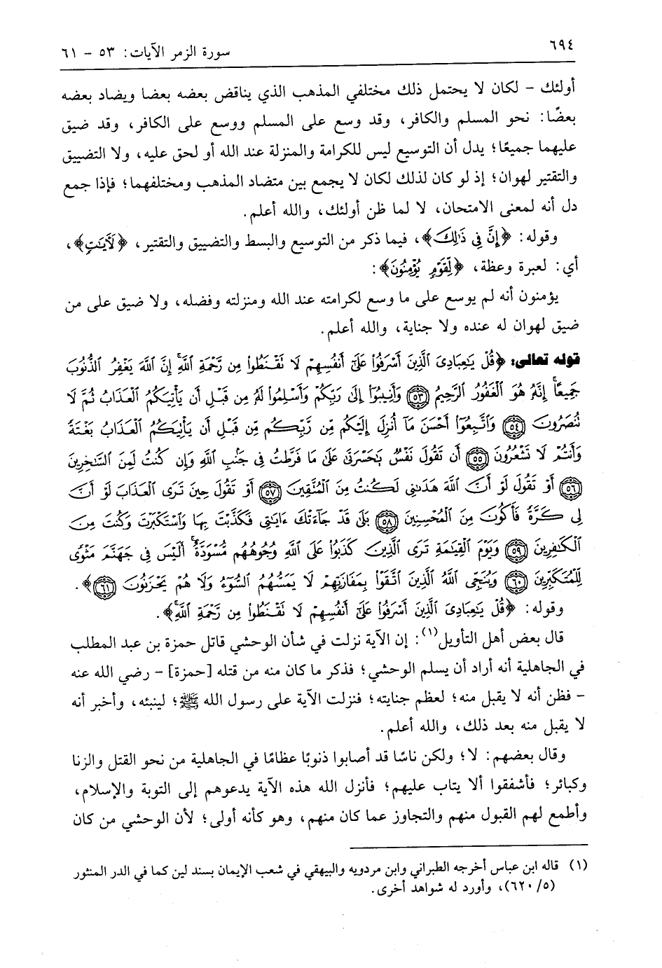 وقَالَ بَعْضُهُمْ: لا؛ ولكن ناسًا قد أصابوا ذنوبًا عظامًا في الجاهلية من نحو القتل والزنا وكبائر؛ فأشفقوا ألا يتاب عليهم؛ فأنزل اللَّه هذه الآية يدعوهم إلى التوبة والإسلام، وأطمع لهم القبول منهم والتجاوز عما كان منهم، وهو كأنه أولى؛ لأن الوحشي من كان