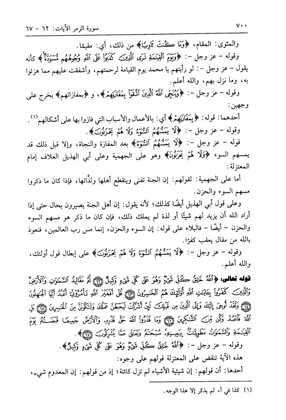 قوله - عَزَّ وَجَلَّ -: (لَا يَمَسُّهُمُ السُّوءُ) بعد المفازة والنجاة، وإلا قبل ذلك قد يمسهم السوء (وَلَا هُمْ يَحْزَنُونَ) وهو على الجهمية وعلى أبي الهذيل العلاف إمام المعتزلة: