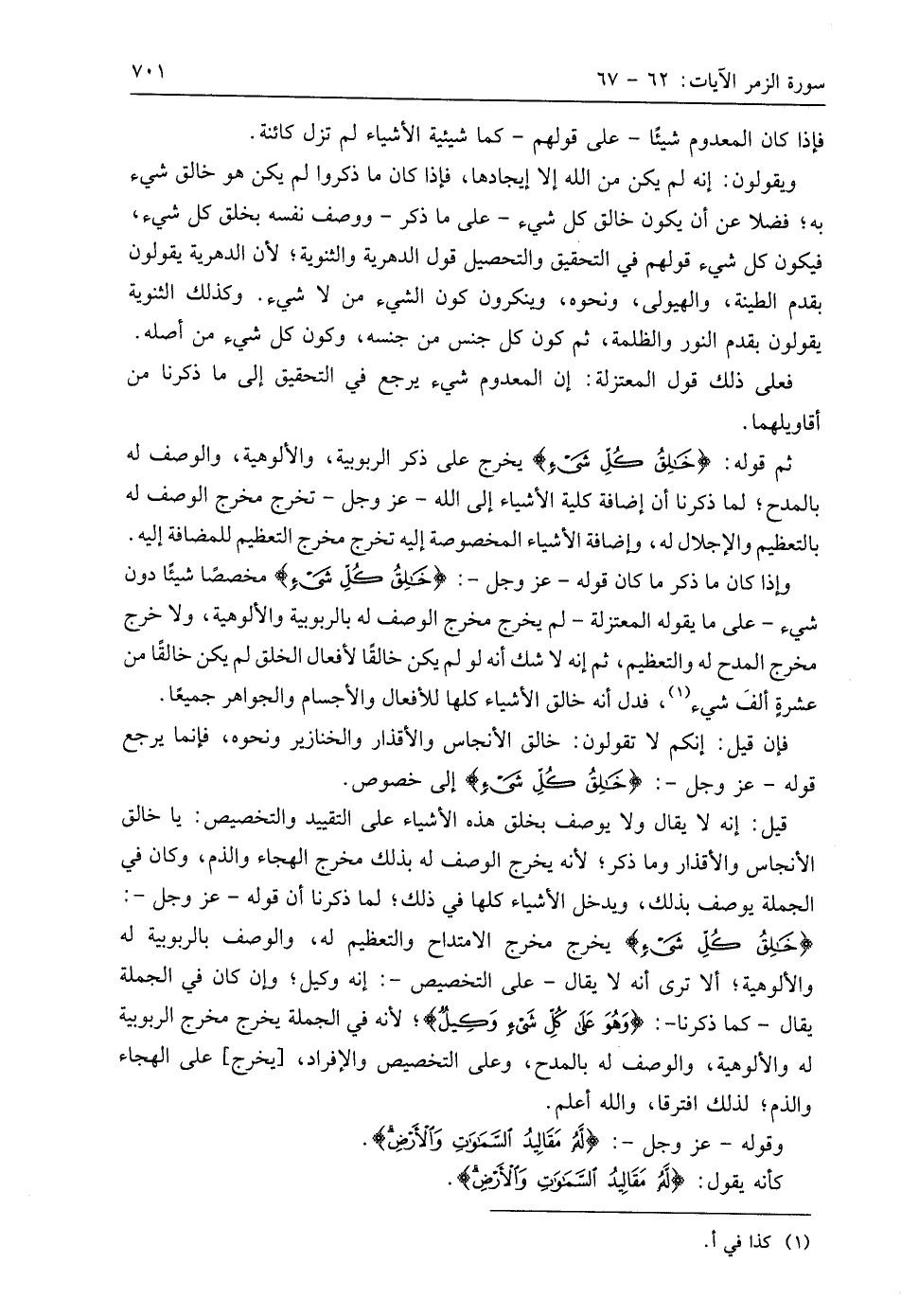 وإذا كان ما ذكر ما كان قوله - عَزَّ وَجَلَّ - (خَالِقُ كُلِّ شَيْءٍ) مخصصًا شيئًا دون شيء -على ما يقوله المعتزلة- لم يخرج مخرج الوصف له بالربوبية والألوهية، ولا خرج مخرج المدح له والتعظيم، ثم إنه لا شك أنه لو لم يكن خالقًا لأفعال الخلق لم يكن خالقًا من عشرةٍ ألفَ شيء، فدل أنه خالق الأشياء كلها للأفعال والأجسام والجواهر جميعًا.