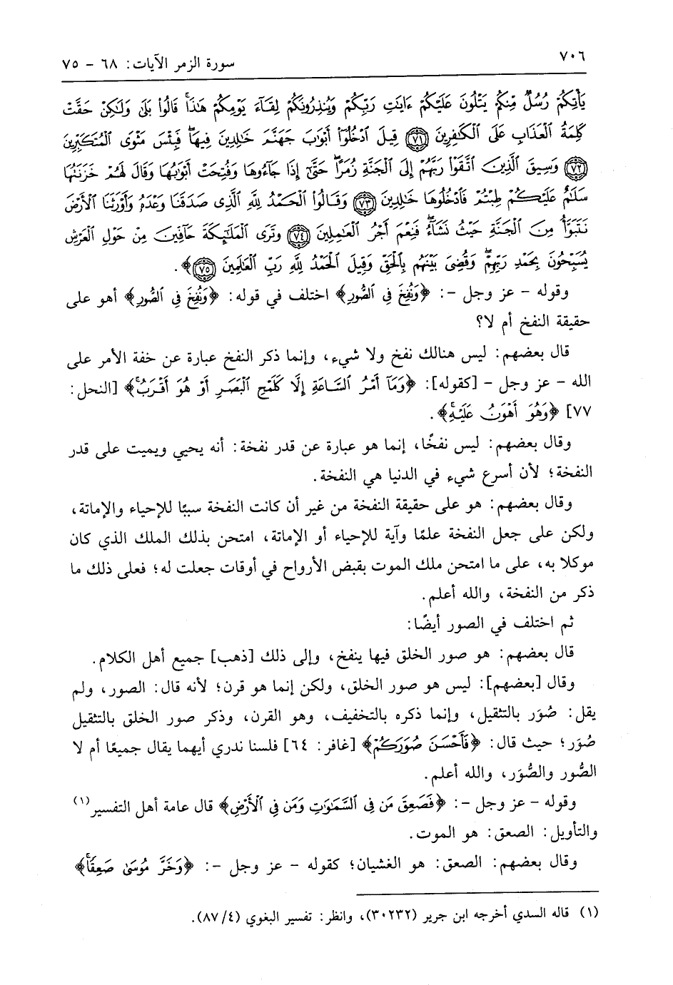 وقوله - عَزَّ وَجَلَّ -: (وَنُفِخَ فِي الصُّورِ ... (68) اختلف في قوله: (وَنُفِخَ فِي الصُّورِ) أهو على حقيقة النفخ أم لا؟