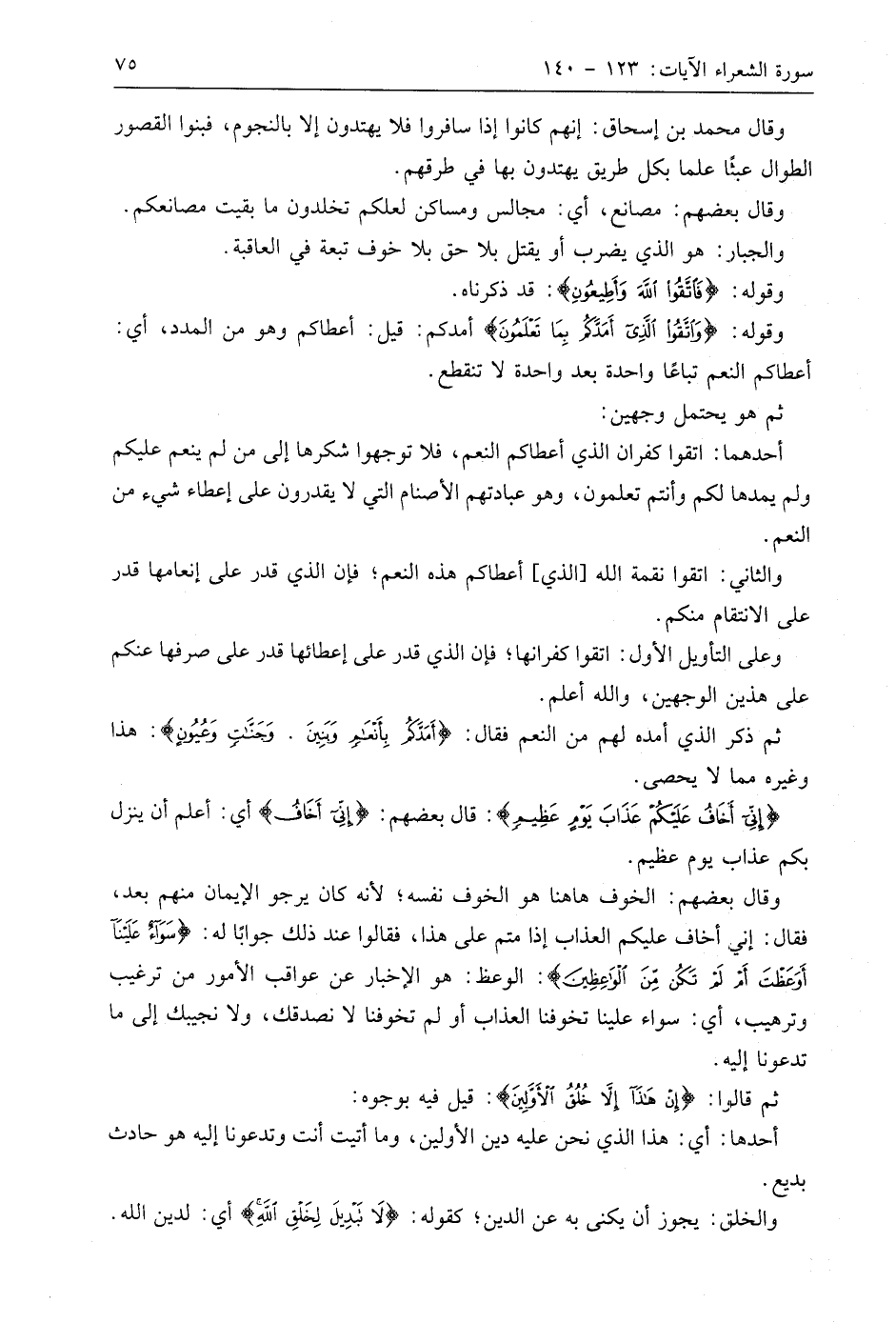 وقَالَ بَعْضُهُمْ: الخوف هاهنا هو الخوف نفسه؛ لأنه كان يرجو الإيمان منهم بعد، فقال: إني أخاف عليكم العذاب إذا متم على هذا، فقالوا عند ذلك جوابًا له: (سَوَاءٌ عَلَيْنَا أَوَعَظْتَ أَمْ لَمْ تَكُنْ مِنَ الْوَاعِظِينَ (136) الوعظ: هو الإخبار عن عواقب الأمور من ترغيب وترهيب، أي: سواء علينا تخوفنا العذاب أو لم تخوفنا لا نصدقك، ولا نجيبك إلى ما تدعونا إليه.