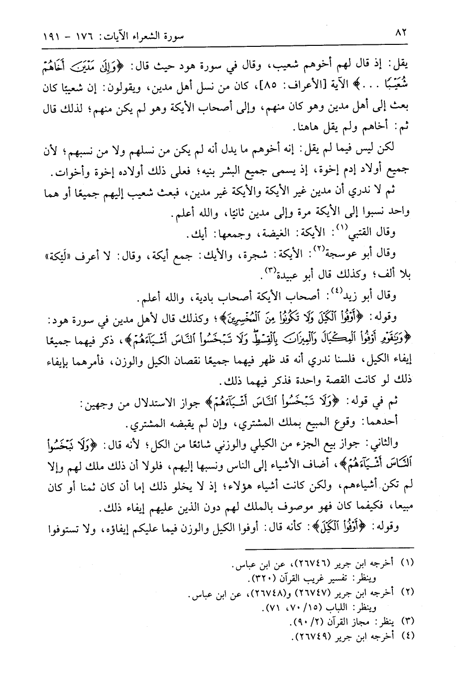 وقوله: (أَوْفُوا الْكَيْلَ وَلَا تَكُونُوا مِنَ الْمُخْسِرِينَ (181) وكذلك قال لأهل مدين في سورة هود: (وَيَا قَوْمِ أَوْفُوا الْمِكْيَالَ وَالْمِيزَانَ بِالْقِسْطِ وَلَا تَبْخَسُوا النَّاسَ أَشْيَاءَهُمْ)، ذكر فيهما جميعًا إيفاء الكيل، فلسنا ندري أنه قد ظهر فيهما جميعًا نقصان الكيل والوزن، فأمرهما بإيفاء ذلك لو كانت القصة واحدة فذكر فيهما ذلك.