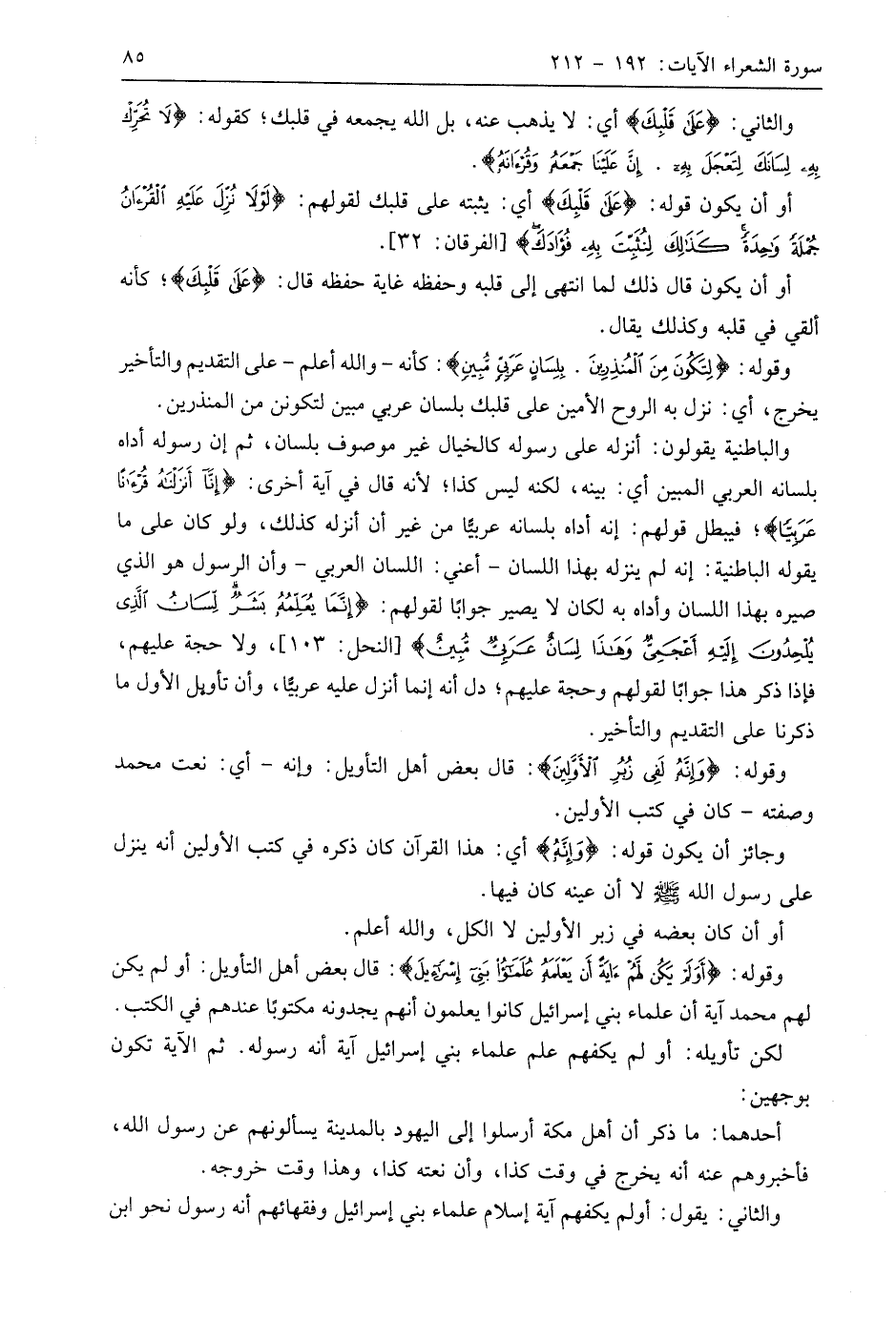وقوله: (لِتَكُونَ مِنَ الْمُنْذِرِينَ (194) بِلِسَانٍ عَرَبِيٍّ مُبِينٍ (195) كأنه - واللَّه أعلم - على التقديم والتأخير يخرج، أي: نزل به الروح الأمين على قلبك بلسان عربي مبين لتكونن من المنذرين.