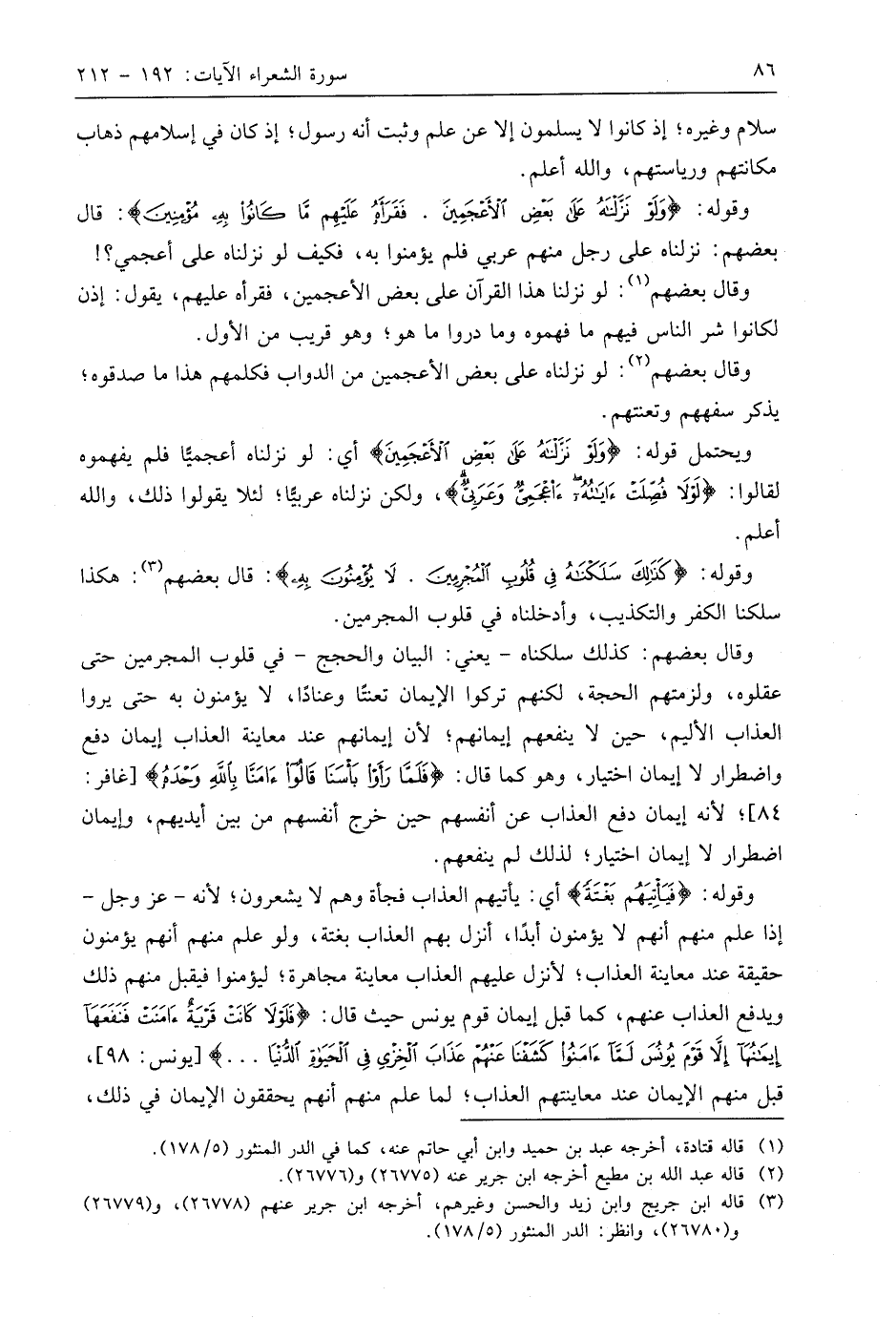 وقوله: (وَلَوْ نَزَّلْنَاهُ عَلَى بَعْضِ الْأَعْجَمِينَ (198) فَقَرَأَهُ عَلَيْهِمْ مَا كَانُوا بِهِ مُؤْمِنِينَ (199) قال بعضهم: نزلناه على رجل منهم عربي فلم يؤمنوا به، فكيف لو نزلناه على أعجمي؟!