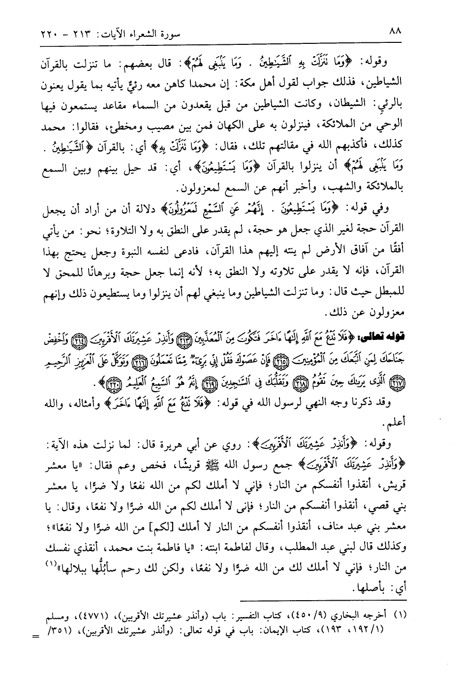 وقوله: (وَأَنْذِرْ عَشِيرَتَكَ الْأَقْرَبِينَ (214) روي عن أبي هريرة قال: لما نزلت هذه الآية: (وَأَنْذِرْ عَشِيرَتَكَ الْأَقْرَبِينَ) جمع رسول اللَّه - صَلَّى اللَّهُ عَلَيهِ وَسَلَّمَ - قريشًا، فخصَّ وعمَّ فقال: " يا معشر قريش، أنقذوا أنفسكم من النار؛ فإني لا أملك لكم من اللَّه نفعًا ولا ضرًّا، يا معشر بني قصي، أنقذوا أنفسكم من النار؛ فإنى لا أملك لكم من اللَّه ضرًّا ولا نفعًا، وقال: يا معشر بني عبد مناف، أنقذوا أنفسكم من النار لا أملك لكم من اللَّه ضرًّا ولا نفعًا "؛ وكذلك قال لبني عبد المطلب، وقال لفاطمة ابنته: " يا فاطمة بنت مُحَمَّد، أنقذي نفسك من النار؛ فإني لا أملك لك من اللَّه ضرا ولا نفعًا، ولكن لك رحم سأبُلُّها ببلالها " أي: بأصلها.