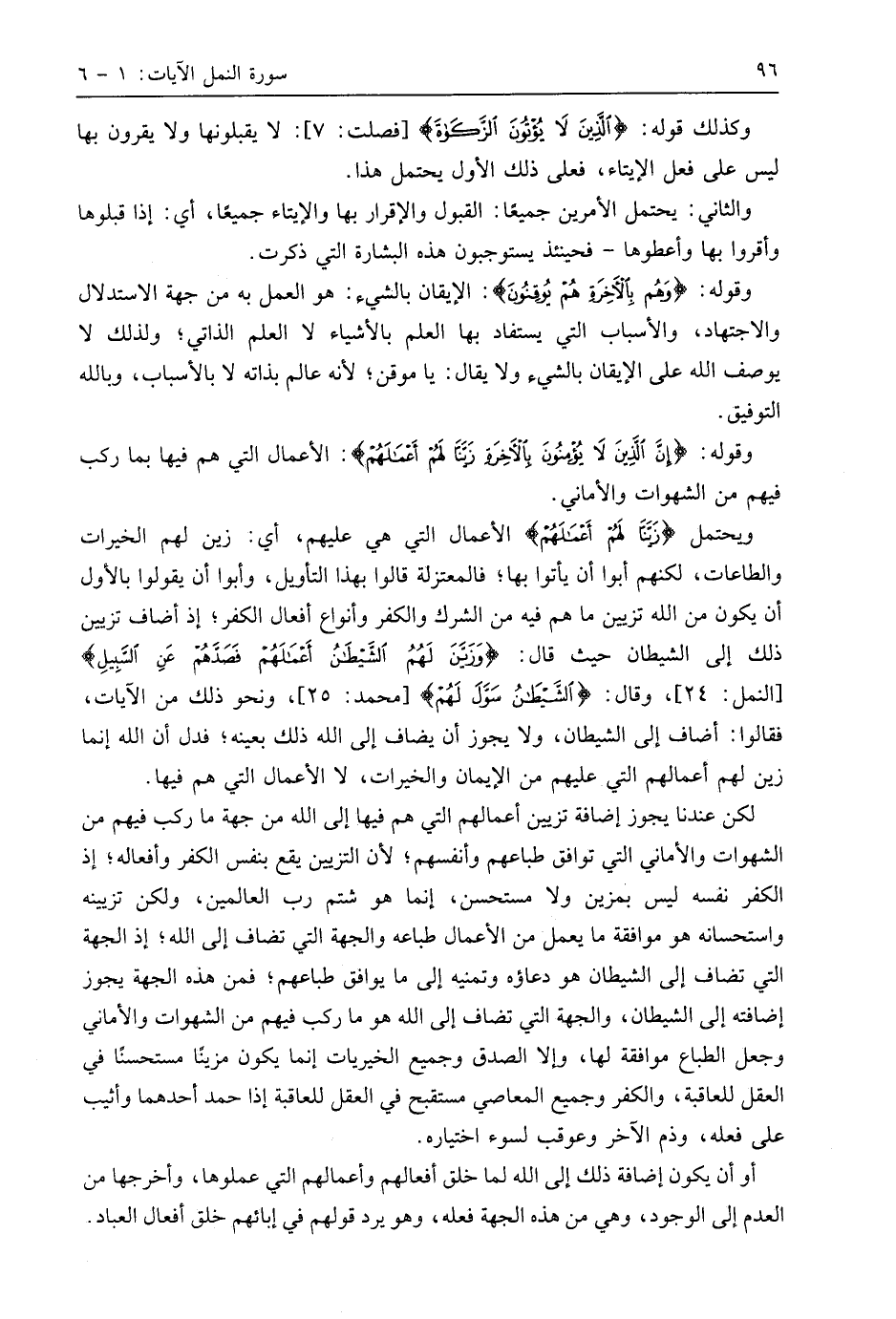 ويحتمل (زَيَّنَّا لَهُمْ أَعْمَالَهُمْ) الأعمال التي هي عليهم، أي: زين لهم الخيرات والطاعات، لكنهم أبوا أن يأتوا بها؛ فالمعتزلة قالوا بهذا التأويل، وأبوا أن يقولوا بالأول أن يكون من اللَّه تزيين ما هم فيه من الشرك والكفر وأنواع أفعال الكفر؛ إذ أضاف تزيين ذلك إلى الشيطان حيث قال: (وَزَيَّنَ لَهُمُ الشَّيْطَانُ أَعْمَالَهُمْ فَصَدَّهُمْ عَنِ السَّبِيلِ)، وقال: (الشَّيْطَانُ سَوَّلَ لَهُمْ)، ونحو ذلك من الآيات، فقالوا: أضاف إلى الشيطان، ولا يجوز أن يضاف إلى اللَّه ذلك بعينه؛ فدل أن اللَّه إنما زين لهم أعمالهم التي عليهم من الإيمان والخيرات، لا الأعمال التي هم فيها.