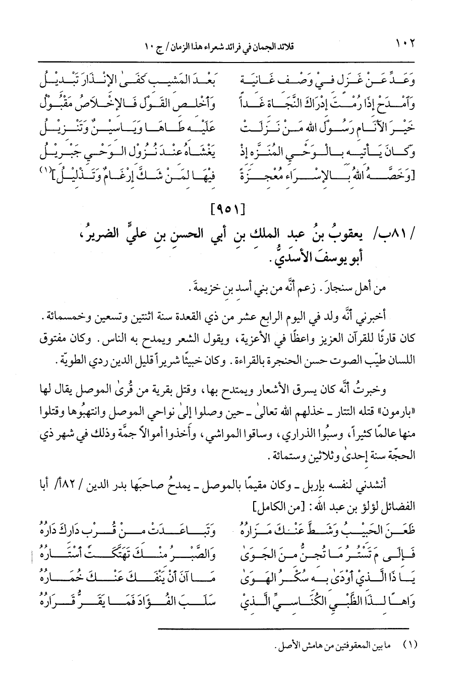 أنشدني لنفسه بإربل –وكان مقيمًا بالموصل- يمدحُ صاحبها بدر الدين /82 أ/ أبا الفضائل لؤلؤ بن عبد الله: [من الكامل]