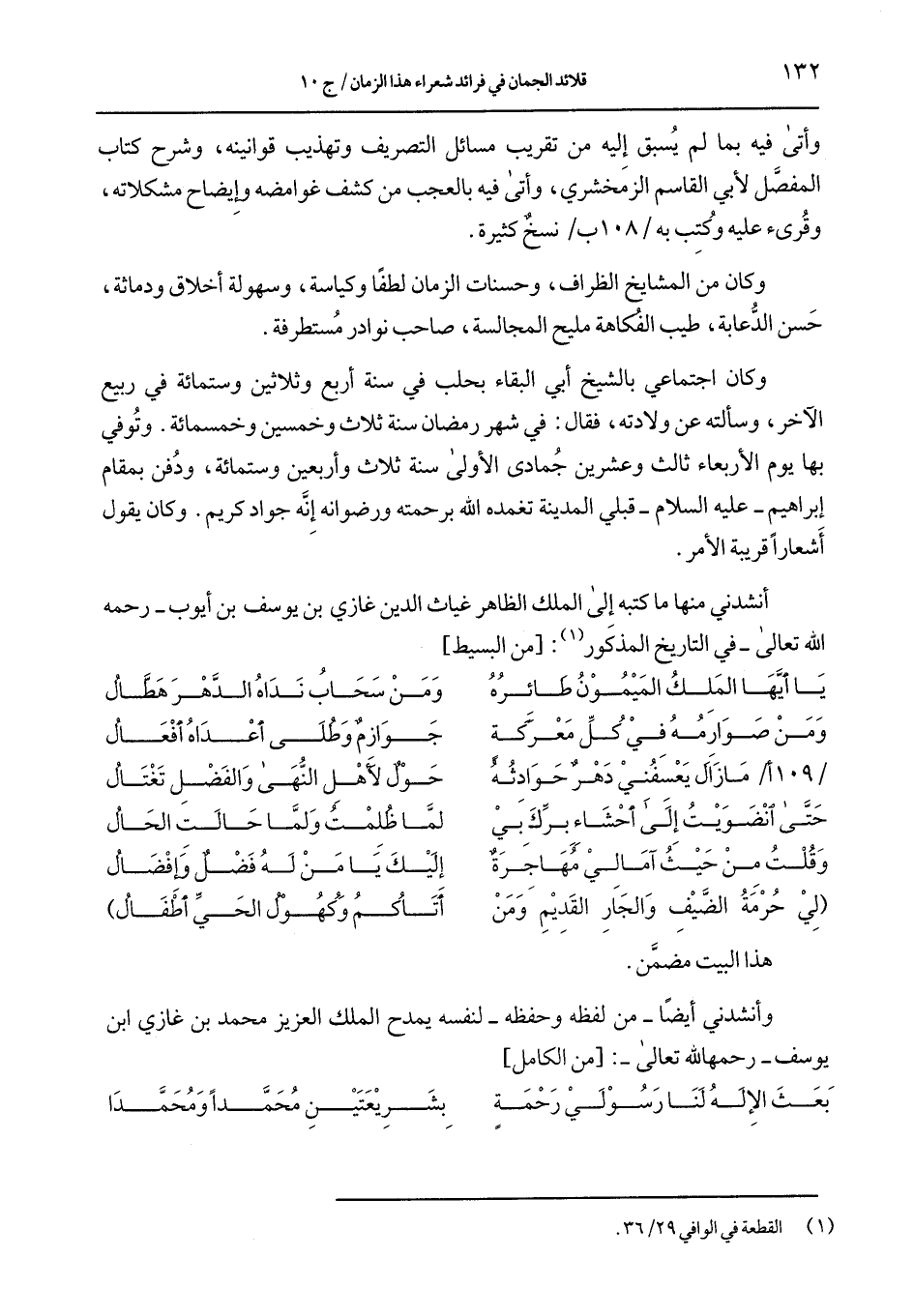 أنشدني منها ما كتبه إلى الملك الظاهر غياث الدين غازي بن يوسف بن أيوب – رحمه الله تعالى – في التاريخ المذكور: [من البسيط]