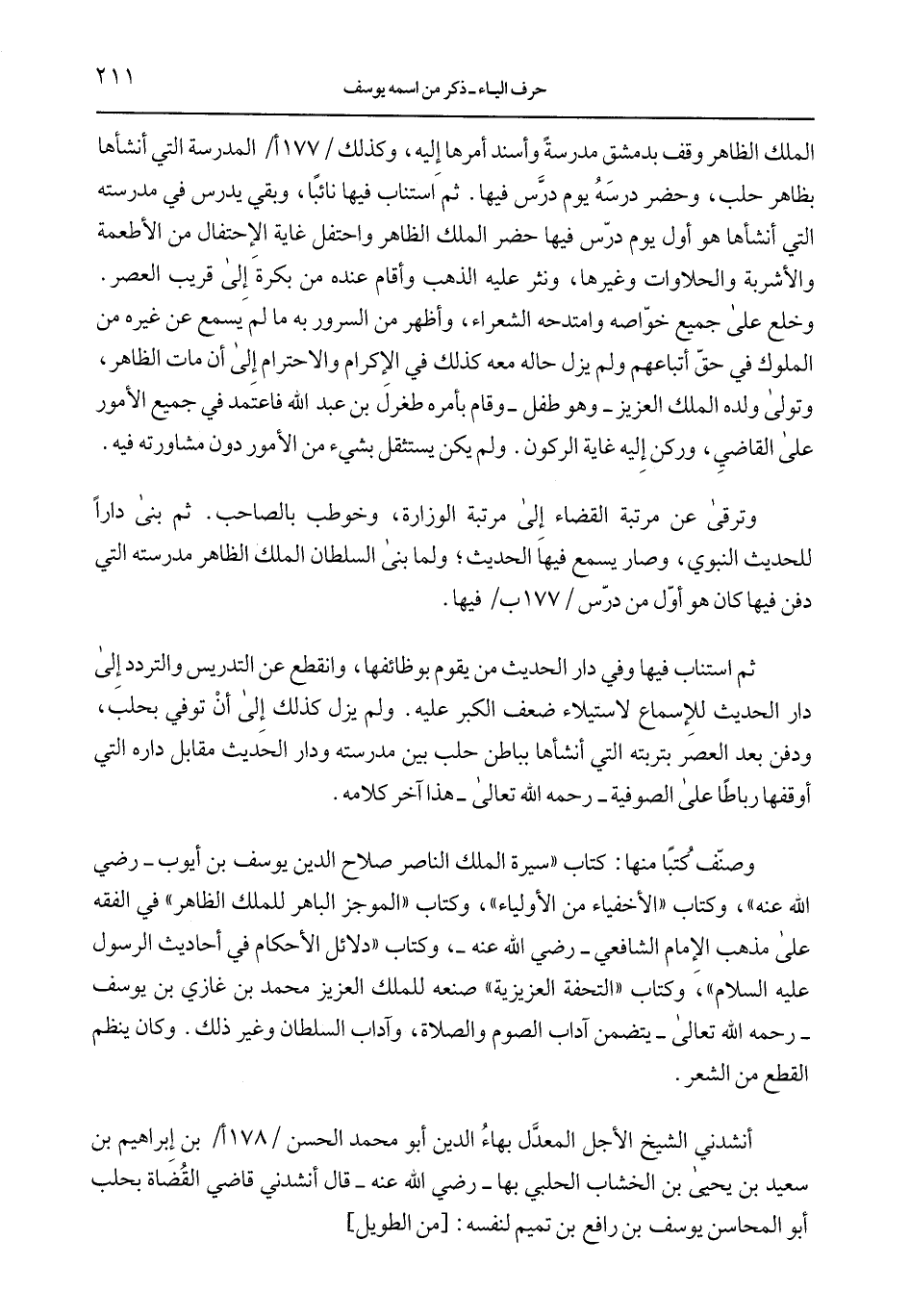 أنشدني الشيخ الأجل المعدَّل بهاء الدين أبو محمد الحسن /178 أ/ بن إبراهيم بن سعيد بن يحي بن الخشاب الحلبي بها ِّ رضي الله عنه ِّ قال أنشدني قاضي القضاة بحلب أبو المحاسن يوسف بن رافع بن تميم لنفسه: [من الطويل]