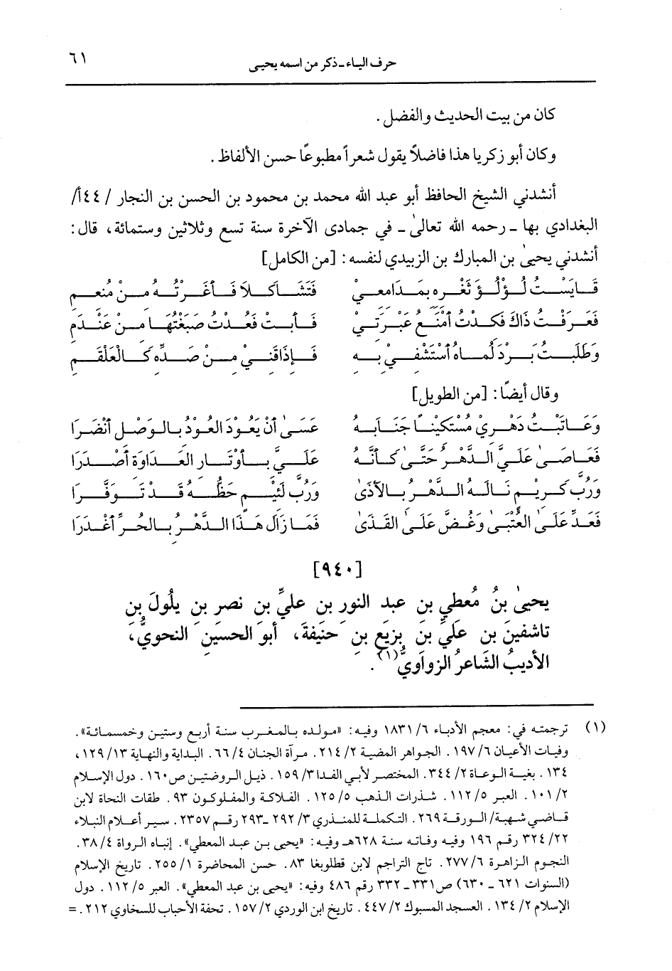 أنشدني الشيخ الحافظ أبو عبد الله محمد بن محمود بن الحسن بن النجار /44 أ/ البغدادي بها- رحمه الله تعالى- في جمادى الآخرة سنة تسع وثلاثين وستمائة، قال: أنشدني يحيى بن المبارك بن الزبيدي لنفسه: [من الكامل]