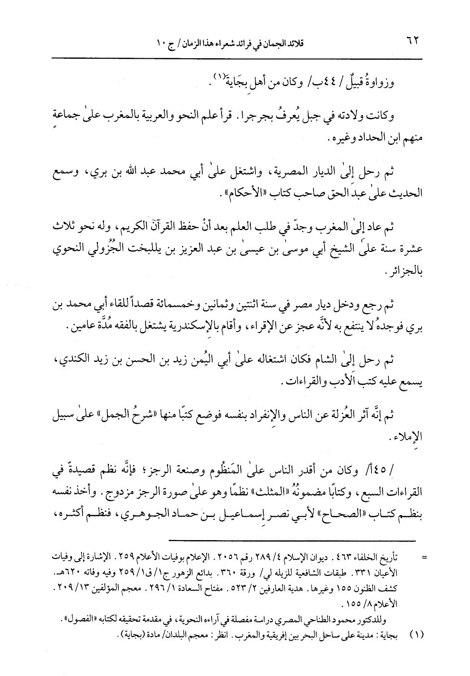 /45 أ/ وكان من أقدر الناس على المنظوم وصنعة الرجز؛ فإنَّه نظم قصيدةً في القراءات السبع، وكتابًا مضمونه "المثلث" نظمًا وهو على صورة الرجز مزدوج. وأخذ نفسه بنظم كتاب "الصحاح" لأبي نصر إسماعيل بن حماد الجوهي، فنظم أكثره،