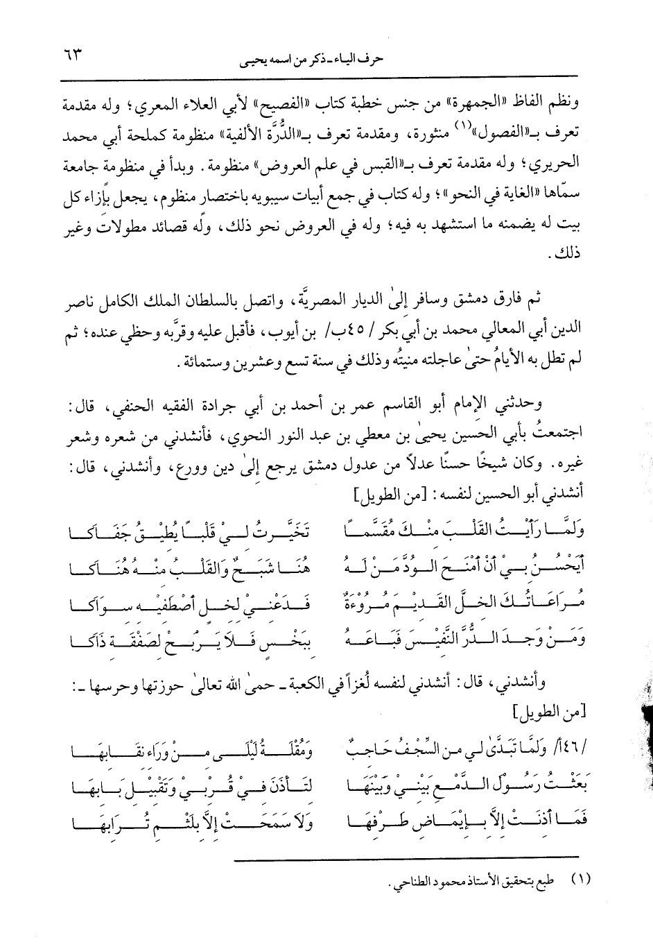 وحدثني الإمام أبو القاسم عمر بن أحمد بن أبي جرادة الفقيه الحنفي، قال: اجتمعت بأبي الحسين يحيى بن معطي بن عبد النور النحوي، فأنشدني من شعره وشعر غيره. وكان شيخًا حسنًا عدلًا من عدول دمشق يرجع إلى دين وورع، وأنشدني، قال: أنشدني أبو الحسين لنفسه: [من الطويل]