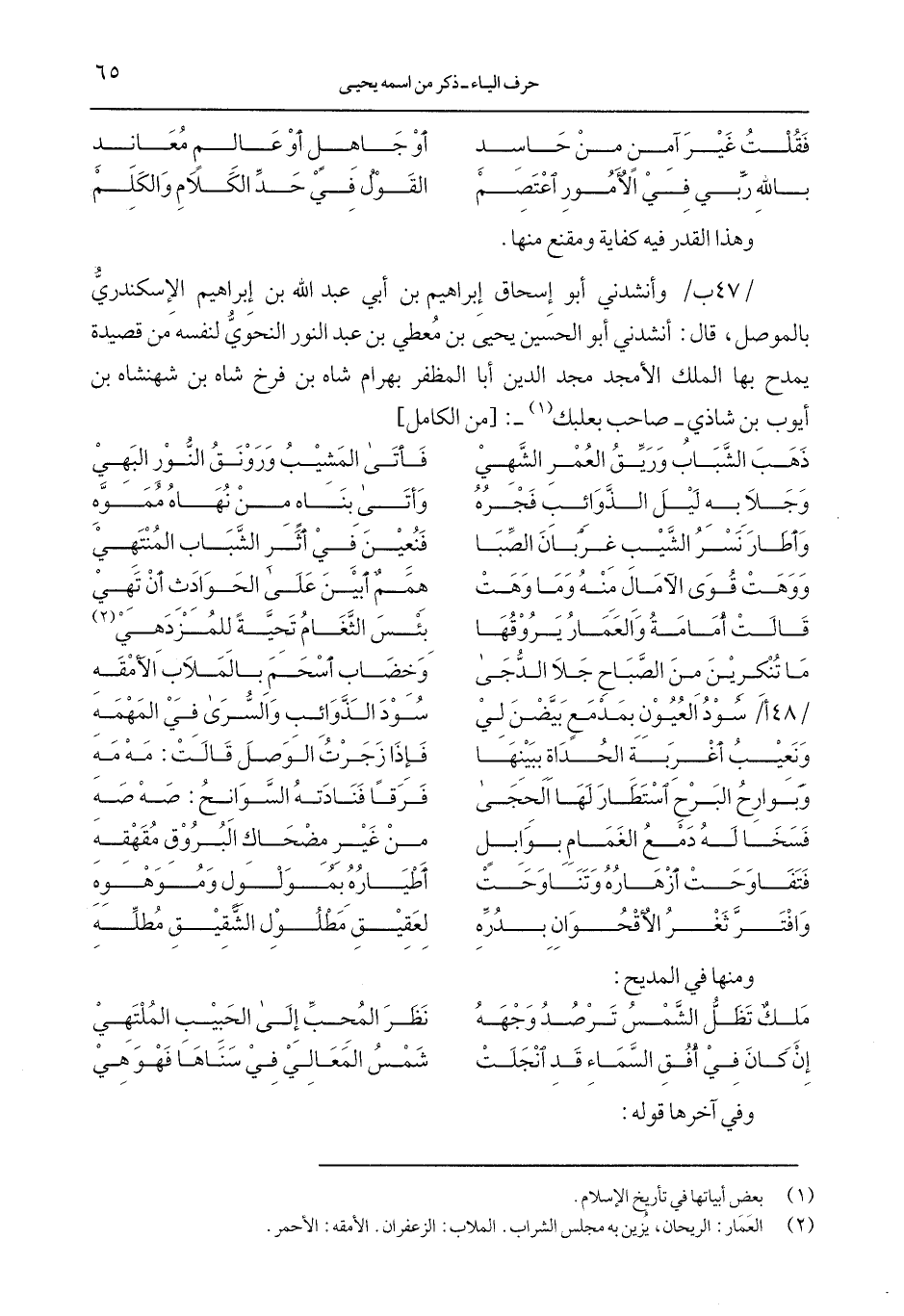 /47 ب/ وأنشدني أبو إسحاق إبراهيم بن أبي عبد الله بن إبراهيم الإسكندريُّ بالموصل، قال: أنشدني أبو الحسين بن معطي بن عبد النور النحويُّ لنفسه من قصيدة بمدح بها الملك الأمجد مجد الدين أبا المظفر بهرام شاه بن فرخ شاه بن شهنشاه بن أيوب بن شاذي- صاحب بعلبك-: [من الكامل]