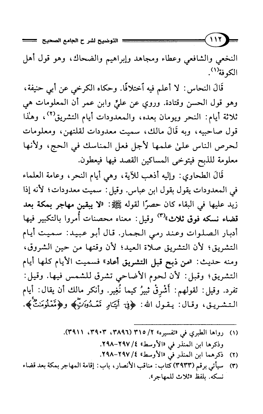 قَالَ الطحاوي: وإليه أذهب للآية، وهي أيام النحر، وعامة العلماء في المعدودات يقول بقول ابن عباس. وقيل: سميت معدودات؛ لأنه إذا زيد عليها في البقاء كان حصرًا لقوله - صلى الله عليه وسلم -: "لا يبقين مهاجر بمكة بعد قضاء نسكه فوق ثلاث" (¬3) وقيل: معناه محصنات أُمروا بالتكبير فيها أدبار الصلوات وعند رمي الجمار. قال أبو عبيد: سميت أيام التشريق؛ لأن التشريق صلاة العيد؛ لأن وقتها من حين الشروق، ومنه حديث: "من ذبح قبل التشريق أعاد" فسميت الأيام كلها أيام التشريق؛ وقبل: لأن لحوم الأضاحي تشرق للشمس فيها. وقيل: تفرد. وقيل: لقولهم: أَشْرِقْ ثبيرُ كيما نُغِير. وأنكر مالك أن يقال: الأم التشريق، وقال: يقول الله: {فِي أَيَّامٍ مَعْدُودَاتٍ} و {مَعْلُومَاتٌ}.