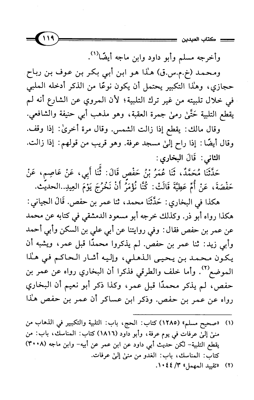 حَدَّثَنَا مُحَمَّدٌ، ثَنَا عُمَرُ بْنُ حَفْصٍ قَالَ: ثَنَا أَبِي، عَنْ عَاصِمٍ، عَنْ حَفْصَةَ، عَنْ أُمِّ عَطِيَّةَ قَالَتْ: كُنَّا نُؤْمَرُ أَنْ نَخْرُجَ يَوْمَ العِيدِ .. الحديث.