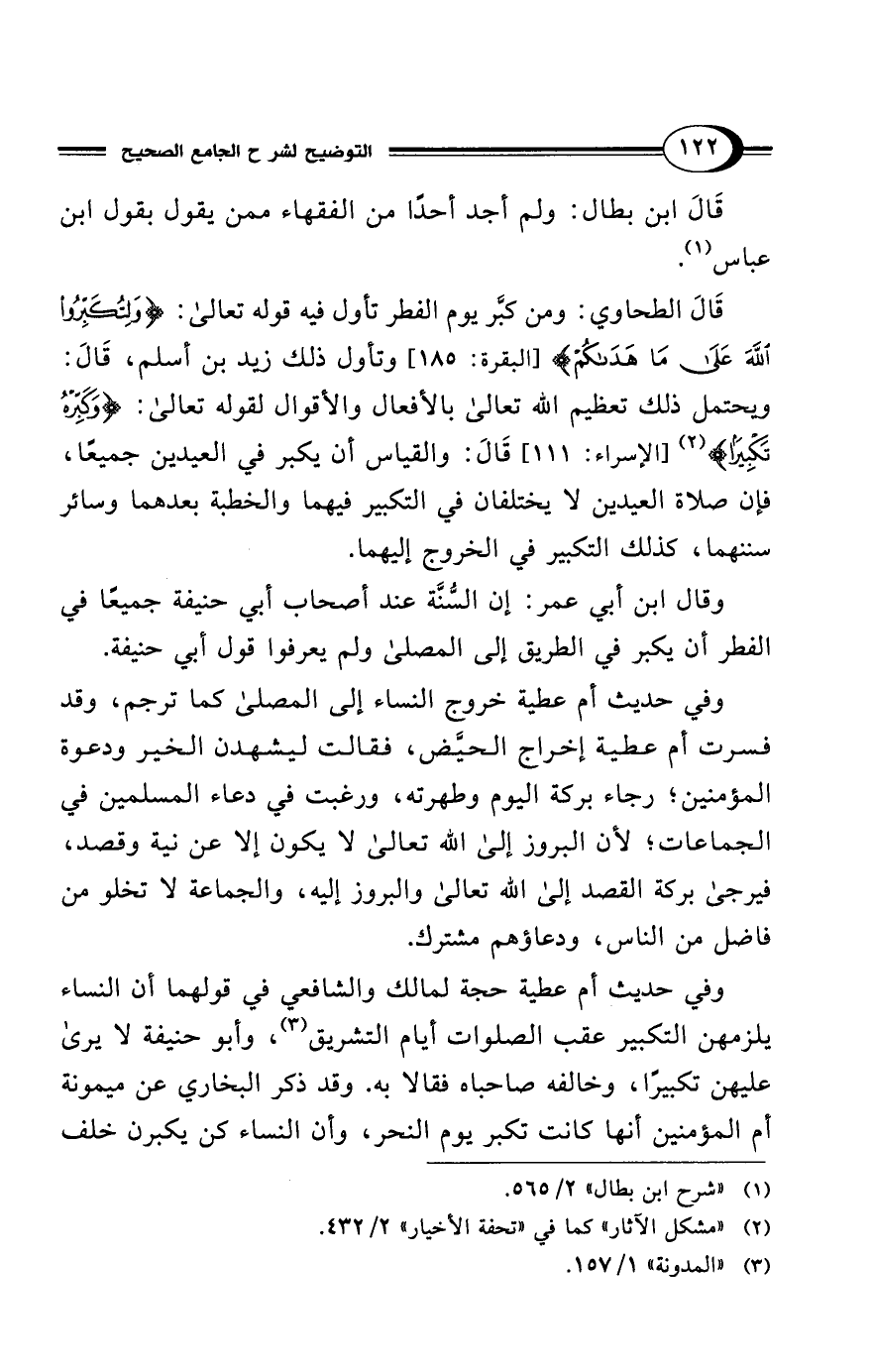 قَالَ الطحاوي: ومن كبَّر يوم الفطر تأول فيه قوله تعالى: {وَلِتُكَبِّرُوا اللَّهَ عَلَى مَا هَدَاكُمْ} [البقرة: 185] وتأول ذلك زيد بن أسلم، قَالَ: ويحتمل ذلك تعظيم الله تعالى بالأفعال والأقوال لقوله تعالى: {وَكَبِّرْهُ تَكْبِيرًا} (¬2) [الإسراء: 111] قَالَ: والقياس أن يكبر في العيدين جميعًا، فإن صلاة العيدين لا يختلفان في التكبير فيهما والخطبة بعدهما وسائر سننهما، كذلك التكبير في الخروج إليهما.