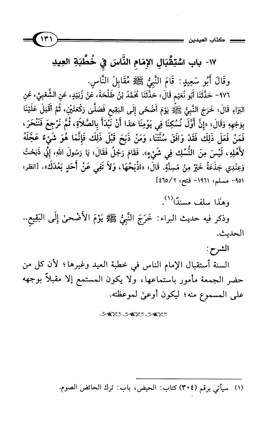 وذكر فيه حديث البراء: خَرَجَ النَّبِيُّ - صلى الله عليه وسلم - يَوْمَ الأَضْحى إِلَى البَقِيعِ .. الحديث.