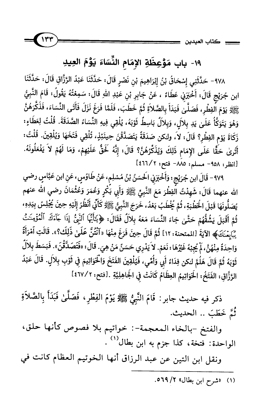 979 - قَالَ ابْنُ جُرَيْجٍ: وَأَخْبَرَنِي الحَسَنُ بْنُ مُسْلِمٍ، عَنْ طَاوُسٍ، عَنِ ابْنِ عَبَّاسٍ رضي الله عنهما قَالَ: شَهِدْتُ الفِطْرَ مَعَ النَّبِيِّ - صلى الله عليه وسلم - وَأَبِي بَكْرٍ وَعُمَرَ وَعُثْمَانَ رضي الله عنهم يُصَلُّونَهَا قَبْلَ الخُطْبَةِ، ثُمَّ يُخْطَبُ بَعْدُ، خَرَجَ النَّبِيُّ - صلى الله عليه وسلم - كَأَنِّي أَنْظُرُ إِلَيْهِ حِينَ يُجْلِسُ بِيَدِهِ، ثُمَّ أَقْبَلَ يَشُقُّهُمْ حَتَّى جَاءَ النِّسَاءَ مَعَهُ بِلاَلٌ فَقَالَ: {يَا أَيُّهَا النَّبِيُّ إِذَا جَاءَكَ الْمُؤْمِنَاتُ يُبَايِعْنَكَ} الآيَةَ [الممتحنة:12] ثُمَّ قَالَ حِينَ فَرَغَ مِنْهَا "آنْتُنَّ عَلَى ذَلِكَ؟ ". قَالَتِ امْرَأَةٌ وَاحِدَةٌ مِنْهُنَّ، لَمْ يُجِبْهُ غَيْرُهَا: نَعَمْ. لاَ يَدْرِى حَسَنٌ مَنْ هِيَ. قَالَ: "فَتَصَدَّقْنَ". فَبَسَطَ بِلاَلٌ ثَوْبَهُ ثُمَّ قَالَ هَلُمَّ لكن فِدَاءٌ أَبِي وَأُمِّي، فَيُلْقِينَ الفَتَخَ وَالخَوَاتِيمَ فِي ثَوْبِ بِلاَلٍ. قَالَ عَبْدُ الرَّزَّاقِ: الفَتَخُ: الخَوَاتِيمُ العِظَامُ كَانَتْ فِي الجَاهِلِيَّةِ. [فتح: 2/ 467]