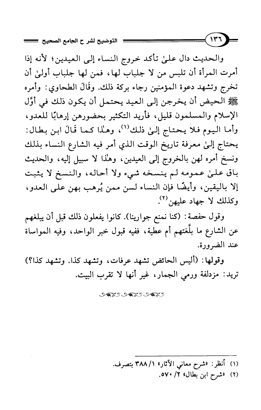 والحديث دال على تأكد خروج النساء إلى العيدين؛ لأنه إذا أمرت المرأة أن تلبس من لا جلباب لها، فمن لها جلباب أولى أن تخرج وتشهد دعوة المؤمنين رجاء بركة ذلك. وقَالَ الطحاوي: وأمره - صلى الله عليه وسلم - الحيض أن يخرجن إلى العيد يحتمل أن يكون ذلك في أوَّل الإسلام والمسلمون قليل، فأريد التكثير بحضورهن إرهابًا للعدو، وأما اليوم فلا يحتاج إلى ذلك (¬1)، وهذا كما قَالَ ابن بطال: يحتاج إلى معرفة تاريخ الوقت الذي أمر فيه الشارع النساء بذلك ونسخ أمره لهن بالخروج إلى العيدين، وهذا لا سبيل إليه، والحديث باق على عمومه لم ينسخه شيء ولا أحاله، والنسخ لا يثبت إلا باليقين، وأيضًا فإن النساء لسن ممن يُرهب بهن على العدو، وكذلك لا جهاد عليهن (¬2).