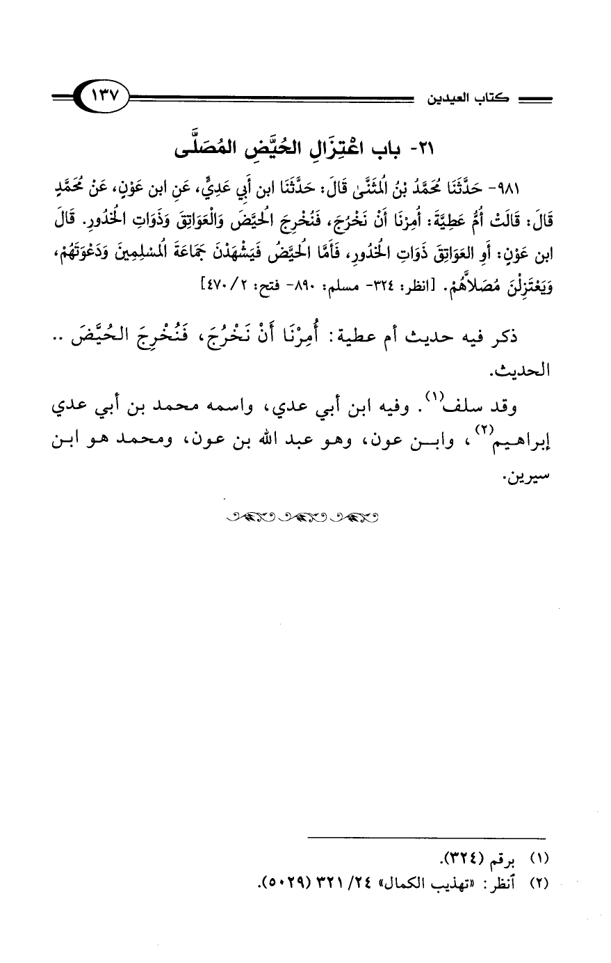 981 - حَدَّثَنَا مُحَمَّدُ بْنُ المُثَنَّى قَالَ: حَدَّثَنَا ابْنُ أَبِي عَدِيٍّ، عَنِ ابْنِ عَوْنٍ، عَنْ مُحَمَّدٍ قَالَ: قَالَتْ أُمُّ عَطِيَّةَ: أُمِرْنَا أَنْ نَخْرُجَ، فَنُخْرِجَ الحُيَّضَ وَالعَوَاتِقَ وَذَوَاتِ الخُدُورِ. قَالَ ابْنُ عَوْنٍ: أَوِ العَوَاتِقَ ذَوَاتِ الخُدُورِ، فَأَمَّا الحُيَّضُ فَيَشْهَدْنَ جَمَاعَةَ المُسْلِمِينَ وَدَعْوَتَهُمْ، وَيَعْتَزِلْنَ مُصَلاَّهُمْ. [انظر: 324 - مسلم: 890 - فتح: 2/ 470]