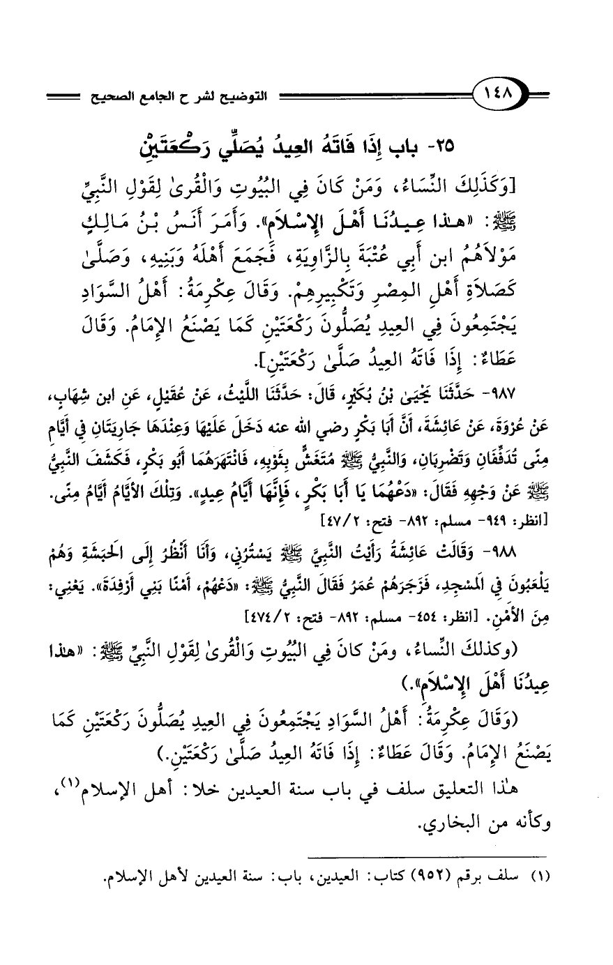 [وَكَذَلِكَ النِّسَاءُ، وَمَنْ كَانَ فِي البُيُوتِ وَالقُرَى لِقَوْلِ النَّبِيِّ - صلى الله عليه وسلم -: "هَذَا عِيدُنَا أَهْلَ الإِسْلاَمِ". وَأَمَرَ أَنَسُ بْنُ مَالِكٍ مَوْلاَهُمُ ابْنَ أَبِي عُتْبَةَ بِالزَّاوِيَةِ، فَجَمَعَ أَهْلَهُ وَبَنِيهِ، وَصَلَّى كَصَلاَةِ أَهْلِ المِصْرِ وَتَكْبِيرِهِمْ. وَقَالَ عِكْرِمَةُ: أَهْلُ السَّوَادِ يَجْتَمِعُونَ فِي العِيدِ يُصَلُّونَ رَكْعَتَيْنِ كَمَا يَصْنَعُ الإِمَامُ. وَقَالَ عَطَاءٌ: إِذَا فَاتَهُ العِيدُ صَلَّى رَكْعَتَيْنِ.]