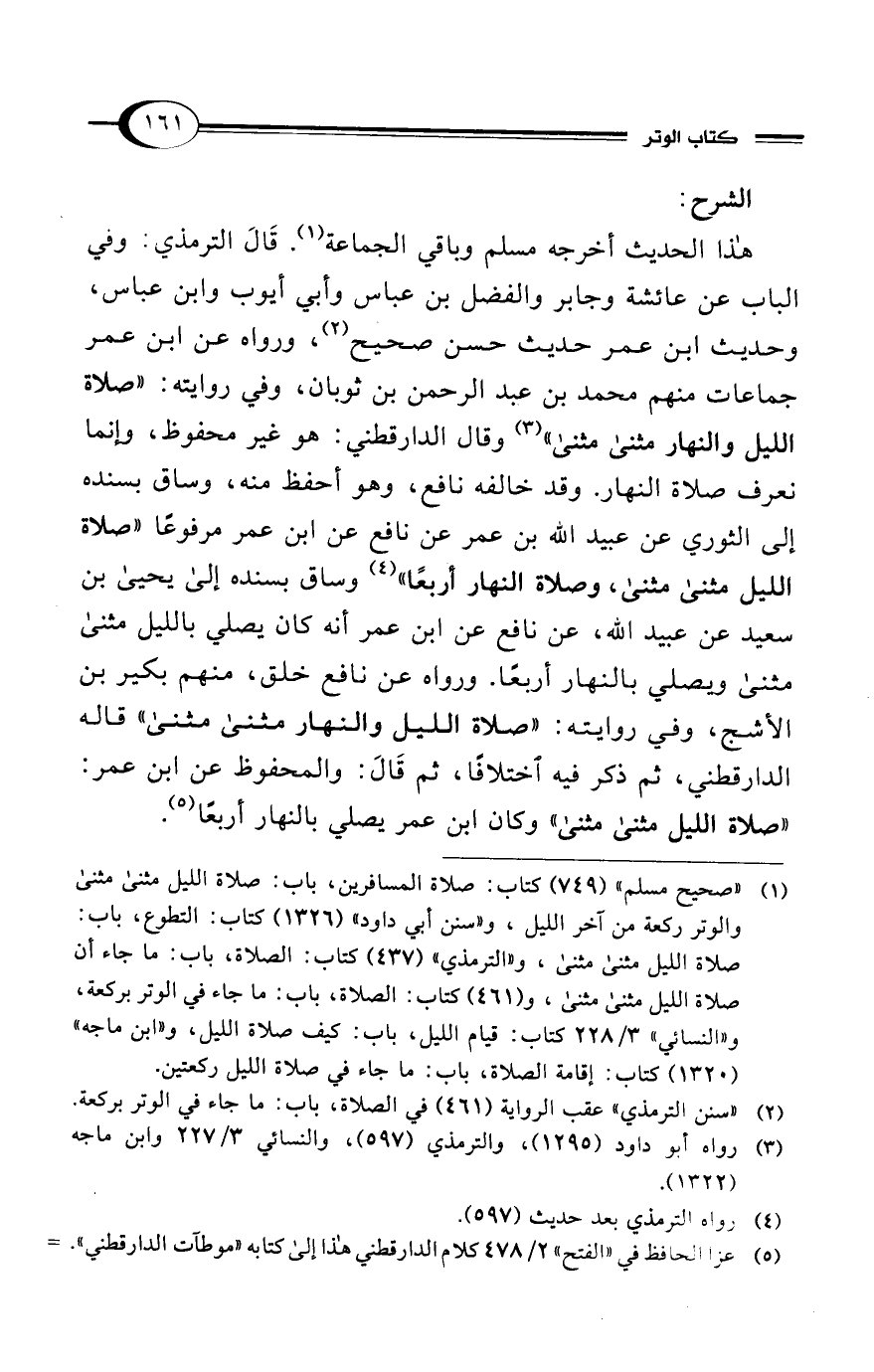 (¬1) "صحيح مسلم" 7491) كتاب: صلاة المسافرين، باب: صلاة الليل مثنى مثنى والوتر ركعة من آخر الليل، و"سنن أبي داود" (1326) كتاب: التطوع، باب: صلاة الليل مثنى مثنى، و"الترمذي" (437) كتاب: الصلاة، باب: ما جاء أن صلاة الليل مثنى مثنى، و (461) كتاب: الصلاة، باب: ما جاء في الوتر بركعة، و"النسائي" 3/ 228 كتاب: قيام الليل، باب: كيف صلاة الليل، و"ابن ماجه" (1320) كتاب: إقامة الصلاة، باب: ما جاء في صلاة الليل ركعتين.