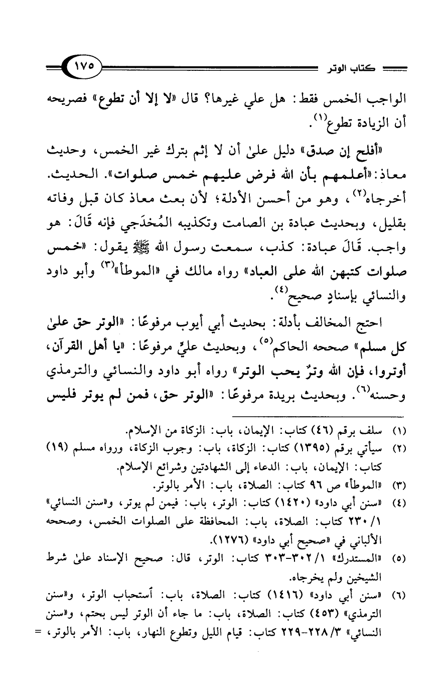 (¬6) "سنن أبي داود" (1416) كتاب: الصلاة، باب: استحباب الوتر، و"سنن الترمذي" (453) كتاب: الصلاة، باب: ما جاء أن الوتر ليس بحتم، و"سنن النسائي" 3/ 228 - 229 كتاب: قيام الليل وتطوع النهار، باب: الأمر بالوتر، =