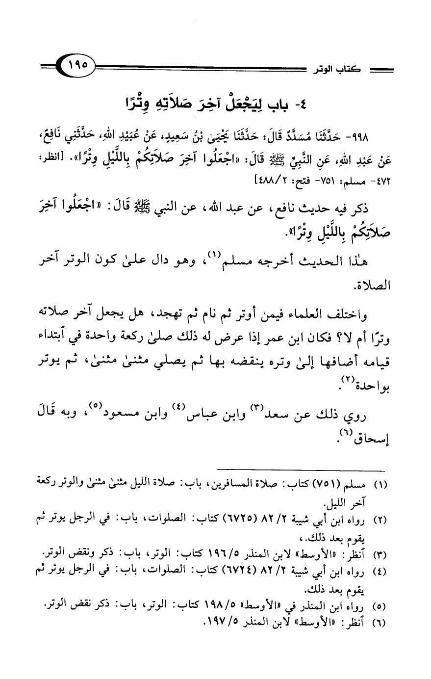 (¬3) انظر: "الأوسط" لابن المنذر 5/ 196 كتاب: الوتر، باب: ذكر ونقض الوتر.