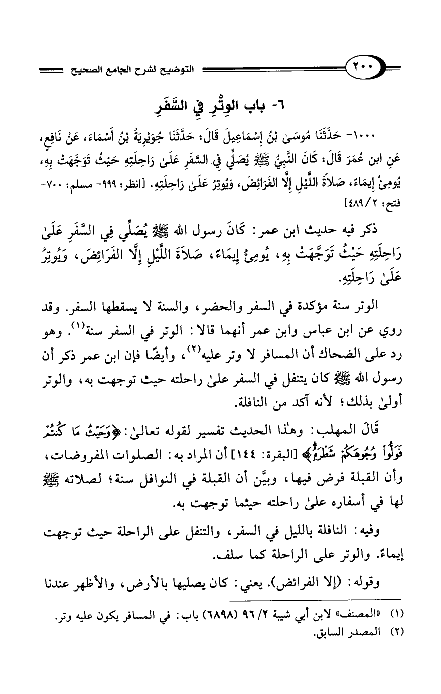 (¬1) "المصنف" لابن أبي شيبة 2/ 96 (6898) باب: في المسافر يكون عليه وتر.