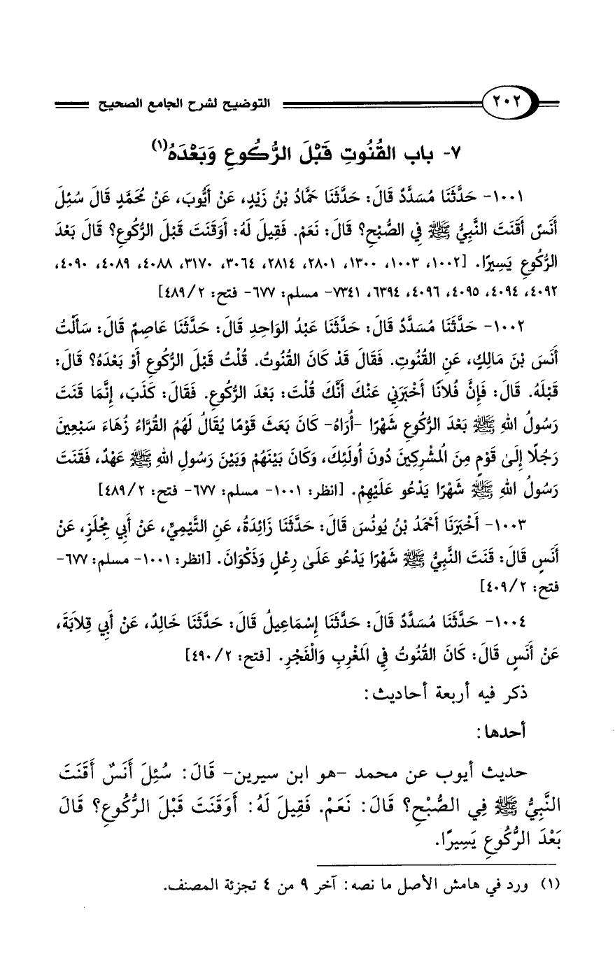 1001 - حَدَّثَنَا مُسَدَّدٌ قَالَ: حَدَّثَنَا حَمَّادُ بْنُ زَيْدٍ، عَنْ أَيُّوبَ، عَنْ مُحَمَّدٍ قَالَ سُئِلَ أَنَسٌ أَقَنَتَ النَّبِيُّ - صلى الله عليه وسلم - فِي الصُّبْحِ؟ قَالَ: نَعَمْ. فَقِيلَ لَهُ: أَوَقَنَتَ قَبْلَ الرُّكُوعِ؟ قَالَ بَعْدَ الرُّكُوعِ يَسِيرًا. [1002،1003، 1300، 2801، 2814، 3064 , 3170، 4088، 4089، 4090، 4092، 4094، 4095، 4096، 6394، 7341 - مسلم: 677 - فتح: 2/ 489]