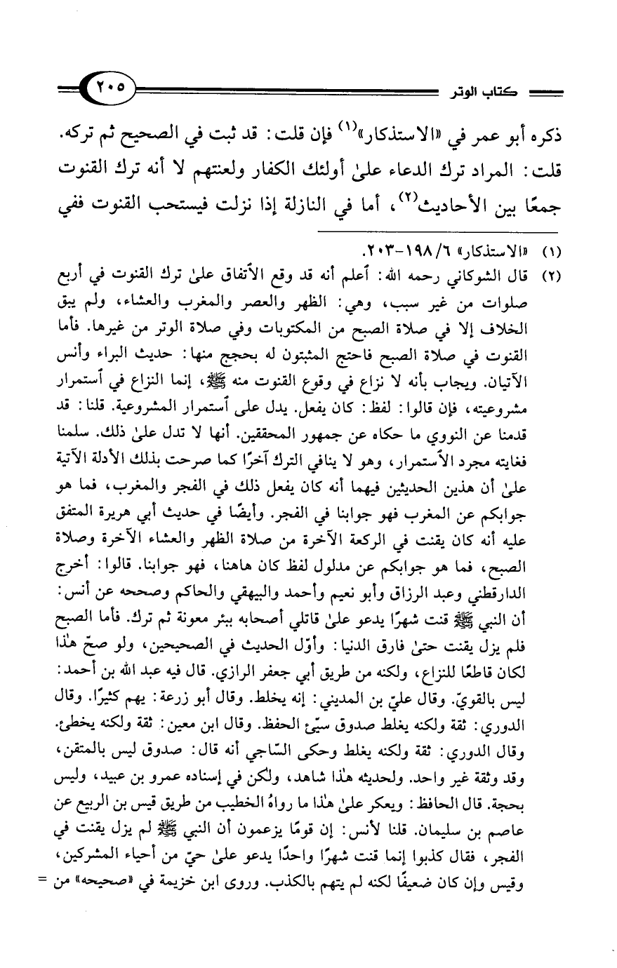 (¬2) قال الشوكاني رحمه الله: اعلم أنه قد وقع الاتفاق على ترك القنوت في أربع صلوات من غير سبب، وهي: الظهر والعصر والمغرب والعشاء، ولم يبق الخلاف إلا في صلاة الصبح من المكتوبات وفي صلاة الوتر من غيرها. فأما القنوت في صلاة الصبح فاحتج المثبتون له بحجج منها: حديث البراء وأنس الآتيان. ويجاب بأنه لا نزاع في وقوع القنوت منه - صلى الله عليه وسلم -، إنما النزاع في استمرار مشروعيته، فإن قالوا: لفظ: كان يفعل. يدل على استمرار المشروعية. قلنا: قد قدمنا عن النووي ما حكاه عن جمهور المحققين. أنها لا تدل على ذلك. سلمنا فغايته مجرد الاستمرار، وهو لا ينافي الترك آخرًا كما صرحت بذلك الأدلة الآتية على أن هذين الحديثين فيهما أنه كان يفعل ذلك في الفجر والمغرب، فما هو جوابكم عن المغرب فهو جوابنا في الفجر. وأيضًا في حديث أبي هريرة المتفق عليه أنه كان يقنت في الركعة الآخرة من صلاة الظهر والعشاء الآخرة وصلاة الصبح، فما هو جوابكم عن مدلول لفظ كان ها هنا، فهو جوابنا. قالوا: أخرج الدارقطني وعبد الرزاق وأبو نعيم وأحمد والبيهقي والحاكم وصححه عن أنس: أن النبي - صلى الله عليه وسلم - قنت شهرًا يدعو على قاتلي أصحابه ببئر معونة ثم ترك. فأما الصبح فلم يزل يقنت حتى فارق الدنيا: وأوّل الحديث في الصحيحين، ولو صحّ هذا لكان قاطعًا للنزاع، ولكنه من طريق أبي جعفر الرازي. قال فيه عبد الله بن أحمد: ليس بالقويّ. وقال عليّ بن المديني: إنه يخلط. وقال أبو زرعة: يهم كثيرًا. وقال الدوري: ثقة ولكنه يغلط صدوق سيّئ الحفظ. وقال ابن معين: ثقة ولكنه يخطئ. وقال الدوري: ثقة ولكنه يغلط وحكى السّاجي أنه قال: صدوق ليس بالمتقن، وقد وثقة غير واحد. ولحديثه هذا شاهد، ولكن في إسناده عمرو بن عبيد، وليس بحجة. قال الحافظ: ويعكر على هذا ما رواهُ الخطيب من طريق قيس بن الربيع عن عاصم بن سليمان. قلنا لأنس: إن قومًا يزعمون أن النبي - صلى الله عليه وسلم - لم يزل يقنت في الفجر، فقال كذبوا إنما قنت شهرًا واحدًا يدعو على حيّ من أحياء المشركين، وقيس وإن كان ضعيفًا لكنه لم يتهم بالكذب. وروى ابن خزيمة في "صحيحه" من =