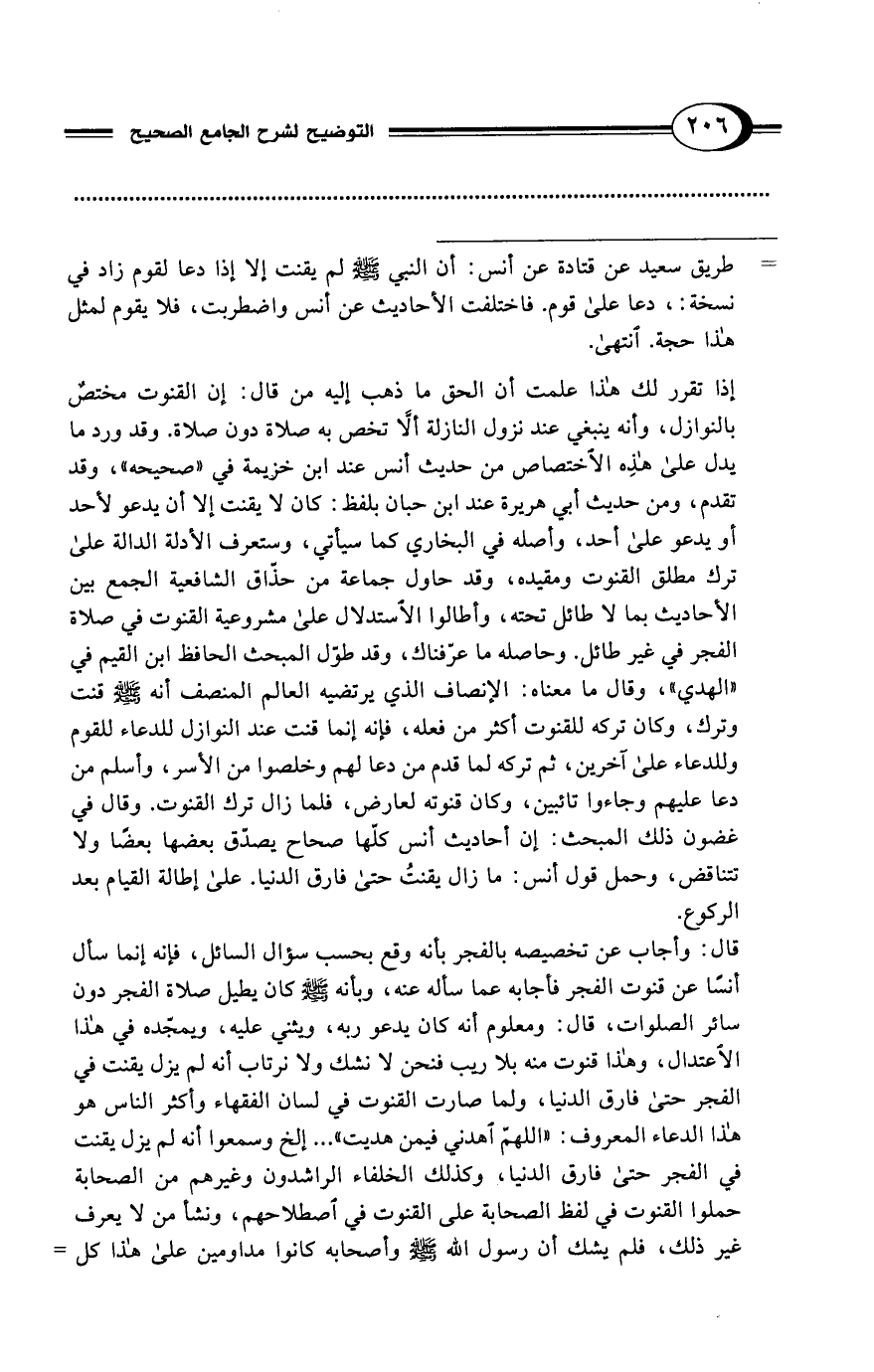 قال: وأجاب عن تخصيصه بالفجر بأنه وقع بحسب سؤال السائل، فإنه إنما سأل أنسًا عن قنوت الفجر فأجابه عما سأله عنه، وبأنه - صلى الله عليه وسلم - كان يطيل صلاة الفجر دون سائر الصلوات، قال: ومعلوم أنه كان يدعو ربه، ويثني عليه، ويمجّده في هذا الاعتدال، وهذا قنوت منه بلا ريب فنحن لا نشك ولا نرتاب أنه لم يزل يقنت في الفجر حتى فارق الدنيا، ولما صارت القنوت في لسان الفقهاء وأكثر الناس هو هذا الدعاء المعروف: "اللهمّ اهدني فيمن هديت" ... إلخ وسمعوا أنه لم يزل يقنت في الفجر حتى فارق الدنيا، وكذلك الخلفاء الراشدون وغيرهم من الصحابة حملوا القنوت في لفظ الصحابة على القنوت في اصطلاحهم، ونشأ من لا يعرف غير ذلك، فلم يشك أن رسول الله - صلى الله عليه وسلم - وأصحابه كانوا مداومين على هذا كل =