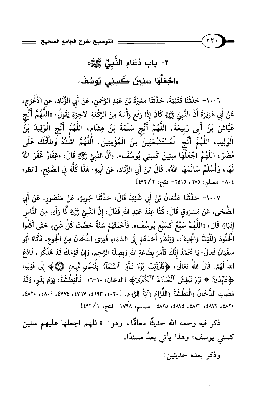 1007 - حَدَّثَنَا عُثْمَانُ بْنُ أَبِي شَيْبَةَ قَالَ: حَدَّثَنَا جَرِيرٌ، عَنْ مَنْصُورٍ، عَنْ أَبِي الضُّحَى، عَنْ مَسْرُوقٍ قَالَ: كُنَّا عِنْدَ عَبْدِ اللهِ فَقَالَ: إِنَّ النَّبِيَّ - صلى الله عليه وسلم - لَمَّا رَأَى مِنَ النَّاسِ إِدْبَارًا قَالَ: "اللَّهُمَّ سَبْعٌ كَسَبْعِ يُوسُفَ". فَأَخَذَتْهُمْ سَنَةٌ حَصَّتْ كُلَّ شَيْءٍ حَتَّى أَكَلُوا الجُلُودَ وَالمَيْتَةَ وَالجِيَفَ، وَيَنْظُرَ أَحَدُهُمْ إِلَى السَّمَاءِ فَيَرَى الدُّخَانَ مِنَ الجُوعِ، فَأَتَاهُ أَبُو سُفْيَانَ فَقَالَ: يَا مُحَمَّدُ إِنَّكَ تَأْمُرُ بِطَاعَةِ اللهِ وَبِصِلَةِ الرَّحِمِ، وَإِنَّ قَوْمَكَ قَدْ هَلَكُوا، فَادْعُ اللهَ لَهُمْ قَالَ اللهُ تَعَالَى: {فَارْتَقِبْ يَوْمَ تَأْتِي السَّمَاءُ بِدُخَانٍ مُبِينٍ (10)} إِلَى قَوْلِهِ: {عَائِدُونَ (15) يَوْمَ نَبْطِشُ الْبَطْشَةَ الْكُبْرَى} [الدخان: 10 - 16] فَالبَطْشَةُ: يَوْمَ بَدْرٍ، وَقَدْ مَضَتِ الدُّخَانُ وَالبَطْشَةُ وَاللِّزَامُ وَآيَةُ الرُّومِ. [1020، 4693، 4767، 4774، 4809، 4820، 4821، 4822، 4823، 4824، 4825 - مسلم: 2798 - فتح: 2/ 492]