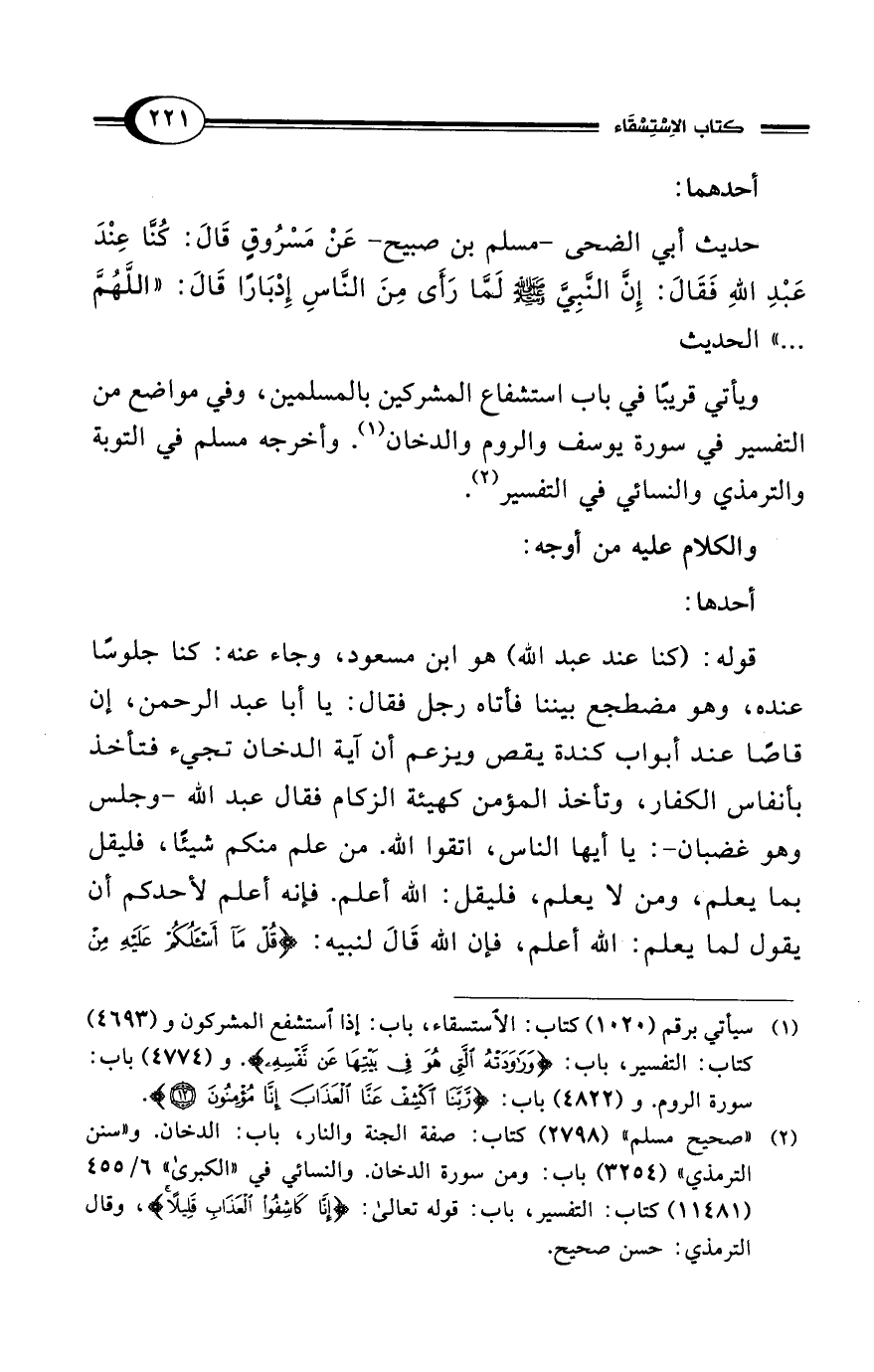 حديث أبي الضحى -مسلم بن صبيح- عَنْ مَسْرُوقٍ قَالَ: كُنَّا عِنْدَ عَبْدِ اللهِ فَقَالَ: إِنَّ النَّبِيَّ - صلى الله عليه وسلم - لَمَّا رَأَى مِنَ النَّاسِ إِدْبَارًا قَالَ: "اللَّهُمَّ ... " الحديث