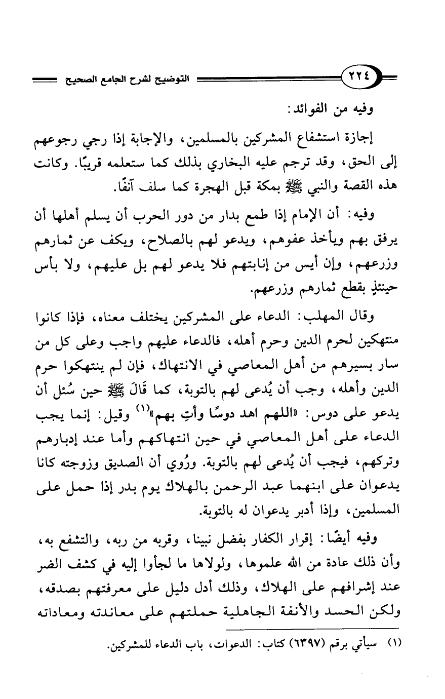 إجازة استشفاع المشركين بالمسلمين، والإجابة إذا رجي رجوعهم إلى الحق، وقد ترجم عليه البخاري بذلك كما ستعلمه قريبًا. وكانت هذه القصة والشعبي - صلى الله عليه وسلم - بمكة قبل الهجرة كما سلف آنفًا.