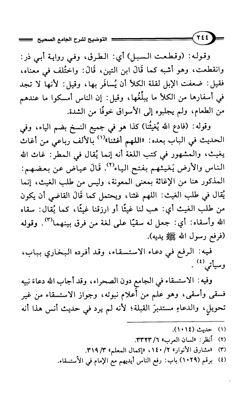 وقوله: (فادع الله يُغيثُنا) كذا هو في جميع النسخ بضم الياء، وفي الحديث في الباب بعده: "اللهم أغثنا" (¬1) بالألف رباعي من أغاث يغيث، والمشهور في كتب اللغة أنه إنما يُقال في المطر: غاث الله الناس والأرض يَغيثهم بفتح الياء (¬2). قَالَ عياض عن بعضهم: المذكور هنا من الإغاثة بمعنى المعونة، وليس من طلب الغيث، إنما يُقال في طلب الغيث: اللهم غثنا، ويحتمل كما قَالَ القاضي أن يكون من طلب الغيث أي: هب لنا غيثًا أو ارزقنا غيثًا، كما يُقال: سقاه الله وأسقاه: أي: جعل له سقيًا على لغة من فرق بينهما (¬3). وقوله (فرفع رسول الله - صلى الله عليه وسلم - يديه).