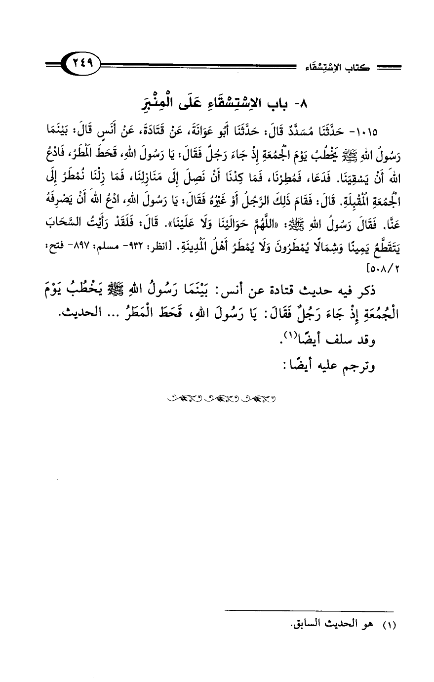 1015 - حَدَّثَنَا مُسَدَّدٌ قَالَ: حَدَّثَنَا أَبُو عَوَانَةَ، عَنْ قَتَادَةَ، عَنْ أَنَسٍ قَالَ: بَيْنَمَا رَسُولُ اللهِ - صلى الله عليه وسلم - يَخْطُبُ يَوْمَ الجُمُعَةِ إِذْ جَاءَ رَجُلٌ فَقَالَ: يَا رَسُولَ اللهِ، قَحَطَ المَطَرُ، فَادْعُ اللهَ أَنْ يَسْقِيَنَا. فَدَعَا، فَمُطِرْنَا، فَمَا كِدْنَا أَنْ نَصِلَ إِلَى مَنَازِلِنَا، فَمَا زِلْنَا نُمْطَرُ إِلَى الجُمُعَةِ المُقْبِلَةِ. قَالَ: فَقَامَ ذَلِكَ الرَّجُلُ أَوْ غَيْرُهُ فَقَالَ: يَا رَسُولَ اللهِ، ادْعُ اللهَ أَنْ يَصْرِفَهُ عَنَّا. فَقَالَ رَسُولُ اللهِ - صلى الله عليه وسلم -: "اللَّهُمَّ حَوَالَيْنَا وَلاَ عَلَيْنَا". قَالَ: فَلَقَدْ رَأَيْتُ السَّحَابَ يَتَقَطَّعُ يَمِينًا وَشِمَالًا يُمْطَرُونَ وَلاَ يُمْطَرُ أَهْلُ المَدِينَةِ. [انظر: 932 - مسلم: 997 - فتح: 2/ 508]