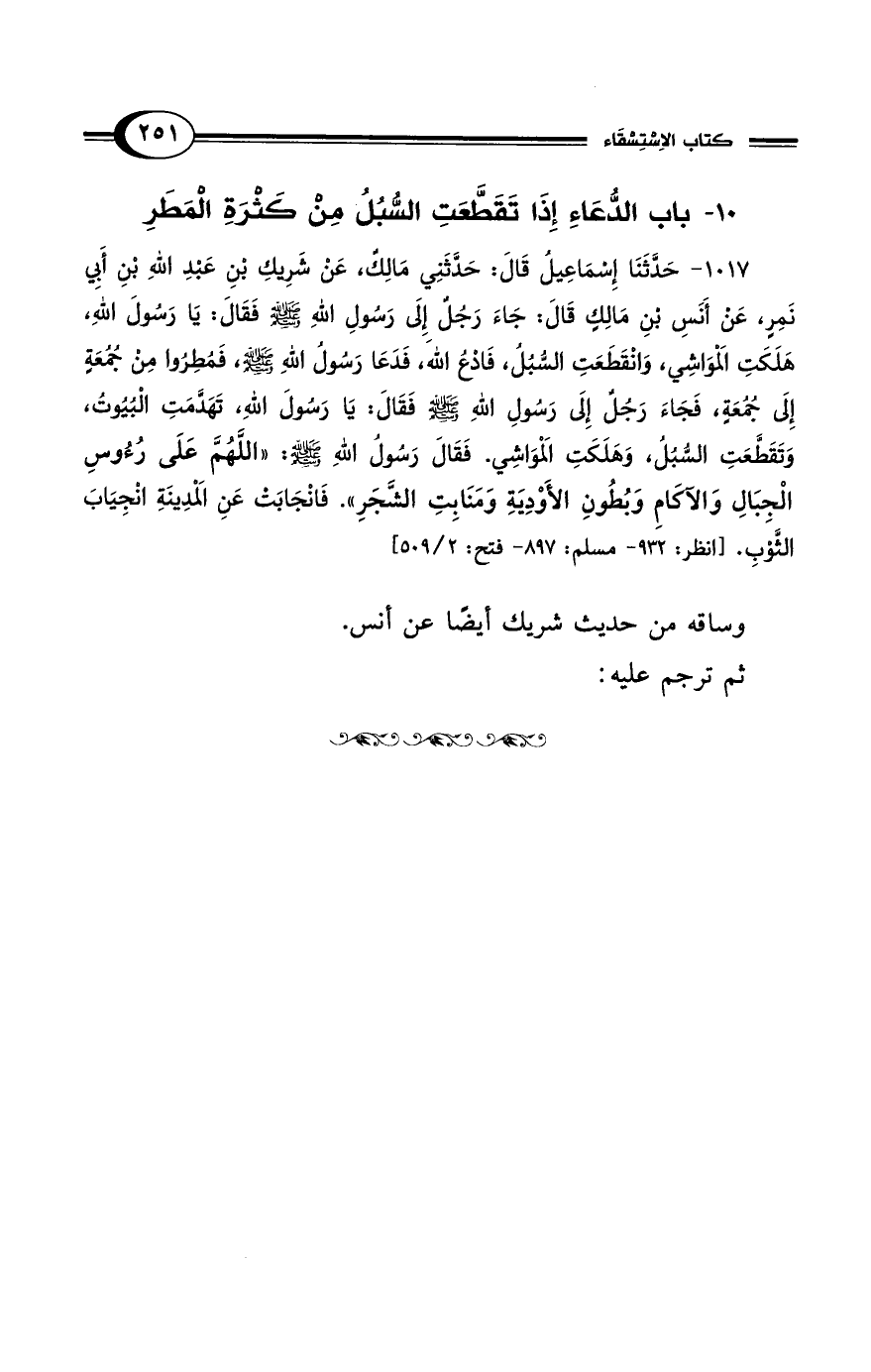 1017 - حَدَّثَنَا إِسْمَاعِيلُ قَالَ: حَدَّثَنِي مَالِكٌ، عَنْ شَرِيكِ بْنِ عَبْدِ اللهِ بْنِ أَبِي نَمِرٍ، عَنْ أَنَسِ بْنِ مَالِكٍ قَالَ: جَاءَ رَجُلٌ إِلَى رَسُولِ اللهِ - صلى الله عليه وسلم - فَقَالَ: يَا رَسُولَ اللهِ، هَلَكَتِ المَوَاشِي، وَانْقَطَعَتِ السُّبُلُ، فَادْعُ الله، فَدَعَا رَسُولُ اللهِ - صلى الله عليه وسلم -، فَمُطِرُوا مِنْ جُمُعَةٍ إِلَى جُمُعَةٍ، فَجَاءَ رَجُلٌ إِلَى رَسُولِ اللهِ - صلى الله عليه وسلم - فَقَالَ: يَا رَسُولَ اللهِ، تَهَدَّمَتِ البُيُوتُ، وَتَقَطَّعَتِ السُّبُلُ، وَهَلَكَتِ المَوَاشِي. فَقَالَ رَسُولُ اللهِ - صلى الله عليه وسلم -: "اللَّهُمَّ عَلَى رُءُوسِ الجِبَالِ وَالآكَامِ وَبُطُونِ الأَوْدِيَةِ وَمَنَابِتِ الشَّجَرِ". فَانْجَابَتْ عَنِ المَدِينَةِ انْجِيَابَ الثَّوْبِ. [انظر: 932 - مسلم: 897 - فتح: 2/ 509]