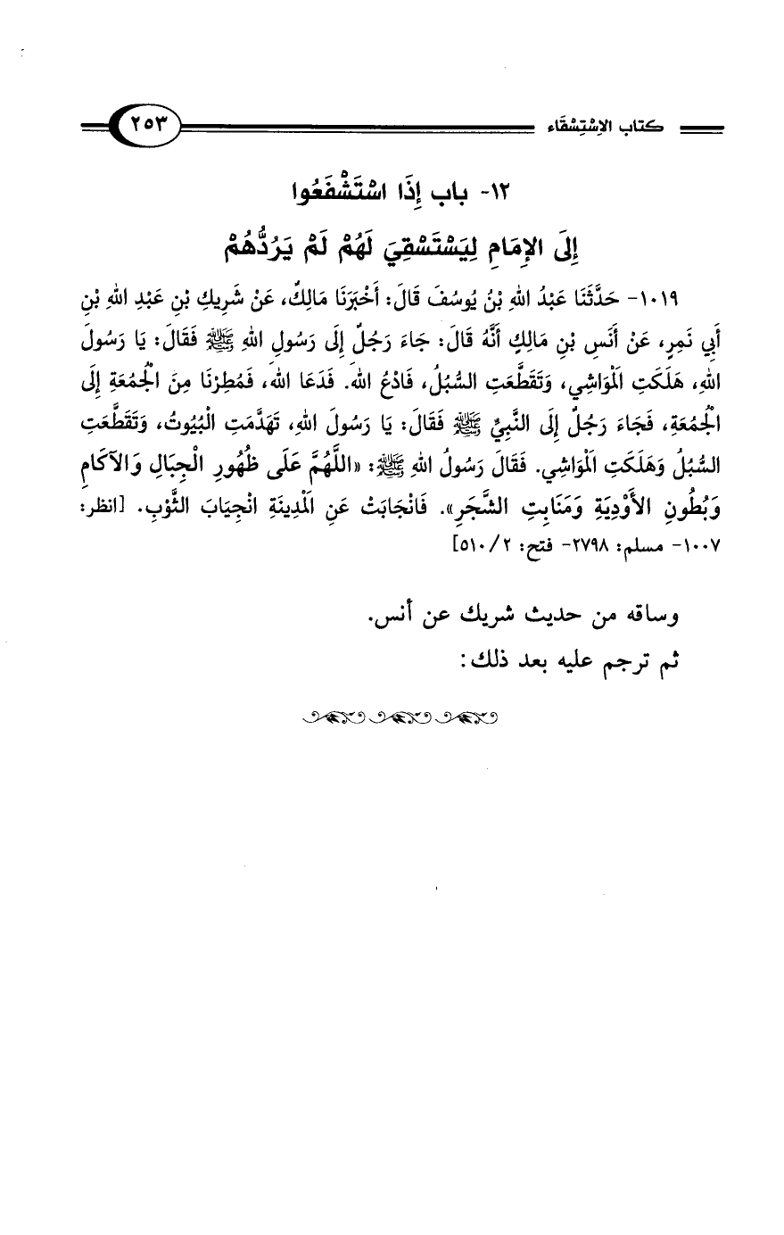1019 - حَدَّثَنَا عَبْدُ اللهِ بْنُ يُوسُفَ قَالَ: أَخْبَرَنَا مَالِكٌ، عَنْ شَرِيكِ بْنِ عَبْدِ اللهِ بْنِ أَبِي نَمِرٍ، عَنْ أَنَسِ بْنِ مَالِكٍ أَنَّهُ قَالَ: جَاءَ رَجُلٌ إِلَى رَسُولِ اللهِ - صلى الله عليه وسلم - فَقَالَ: يَا رَسُولَ اللهِ، هَلَكَتِ المَوَاشِي، وَتَقَطَّعَتِ السُّبُلُ، فَادْعُ الله. فَدَعَا الله، فَمُطِرْنَا مِنَ الجُمُعَةِ إِلَى الجُمُعَةِ، فَجَاءَ رَجُلٌ إِلَى النَّبِيِّ - صلى الله عليه وسلم - فَقَالَ: يَا رَسُولَ اللهِ، تَهَدَّمَتِ البُيُوتُ، وَتَقَطَّعَتِ السُّبُلُ وَهَلَكَتِ المَوَاشِي. فَقَالَ رَسُولُ اللهِ - صلى الله عليه وسلم -: "اللَّهُمَّ عَلَى ظُهُورِ الجِبَالِ وَالآكَامِ وَبُطُونِ الأَوْدِيَةِ وَمَنَابِتِ الشَّجَرِ". فَانْجَابَتْ عَنِ المَدِينَةِ انْجِيَابَ الثَّوْبِ. [انظر: 1007 - مسلم: 2798 - فتح: 2/ 510]